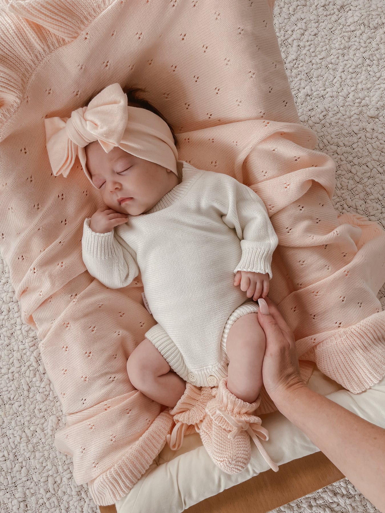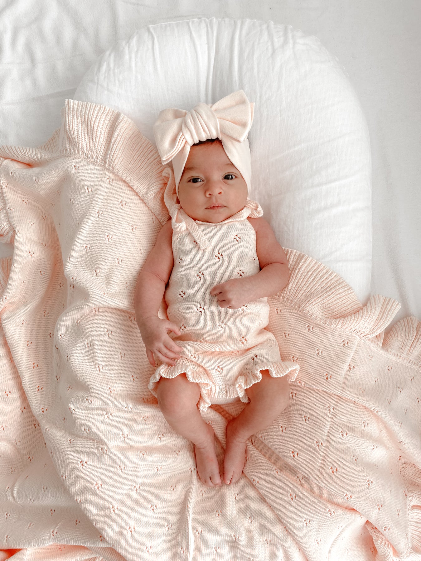 A thin knit blanket featuring gorgeous pointelle detail and a frill hem. A lightweight knitted blanket, match with our Primrose Signature Collection.