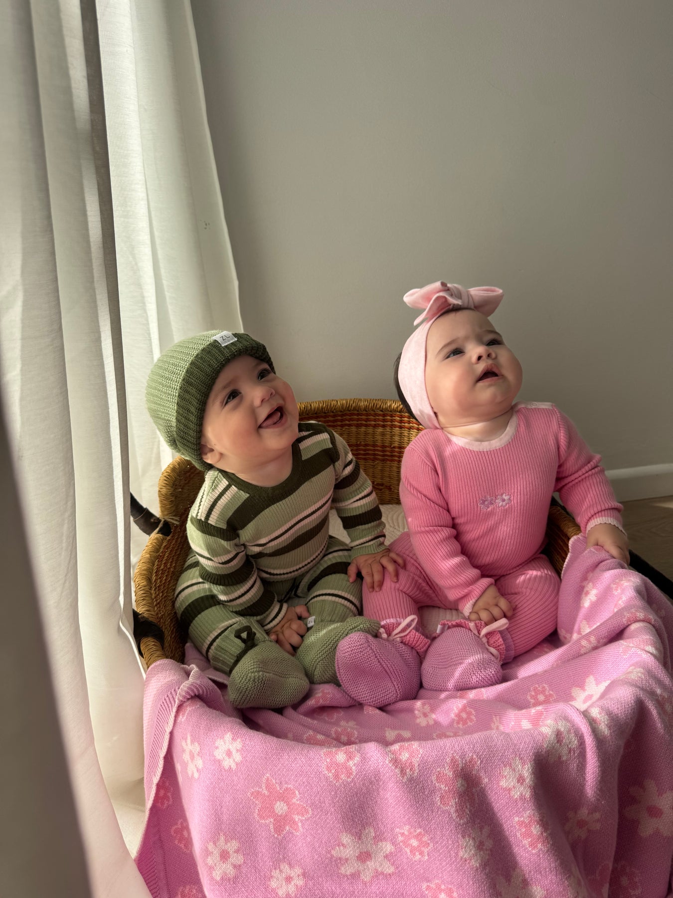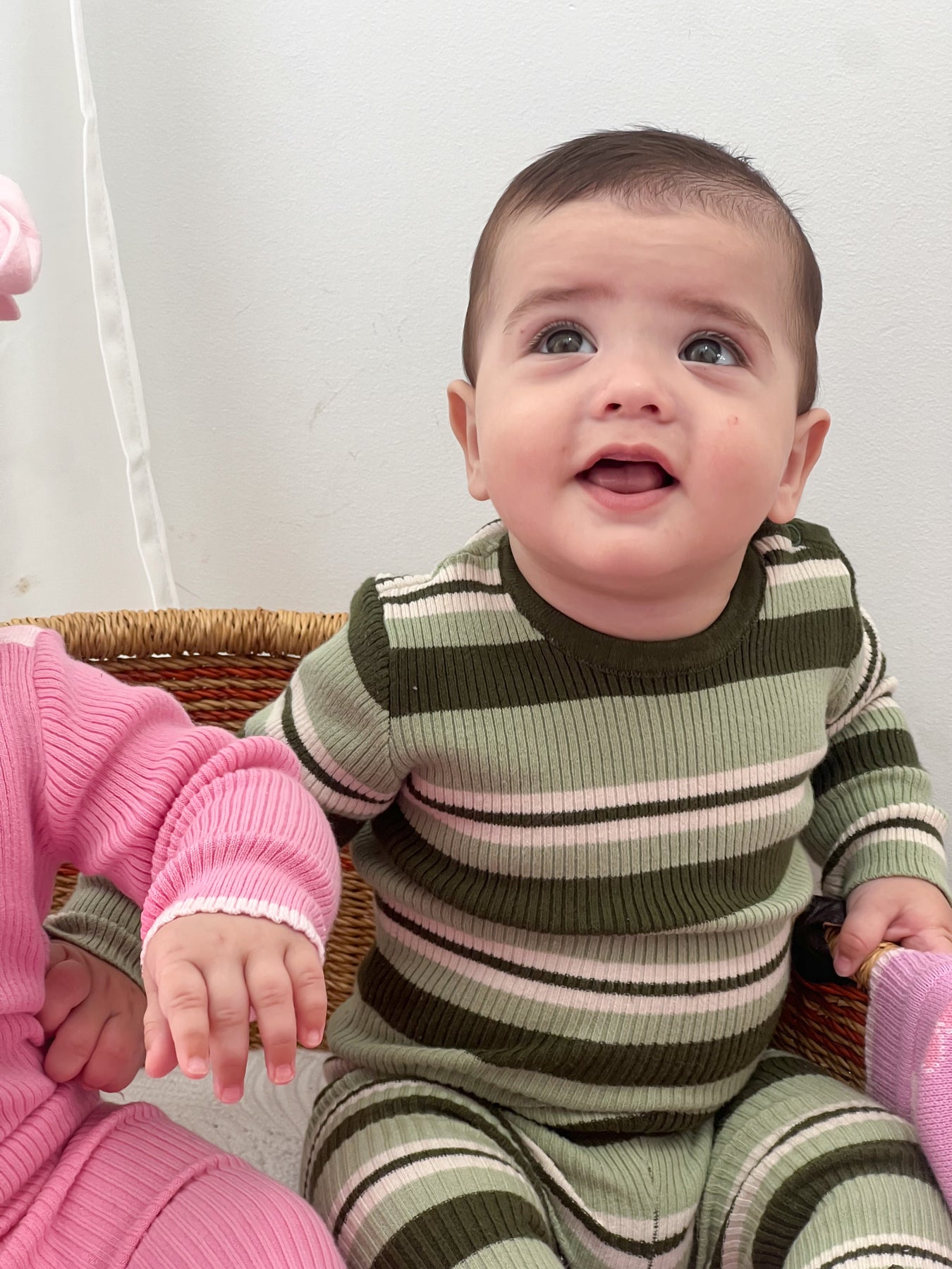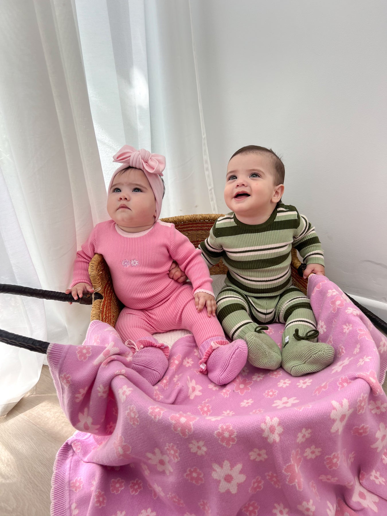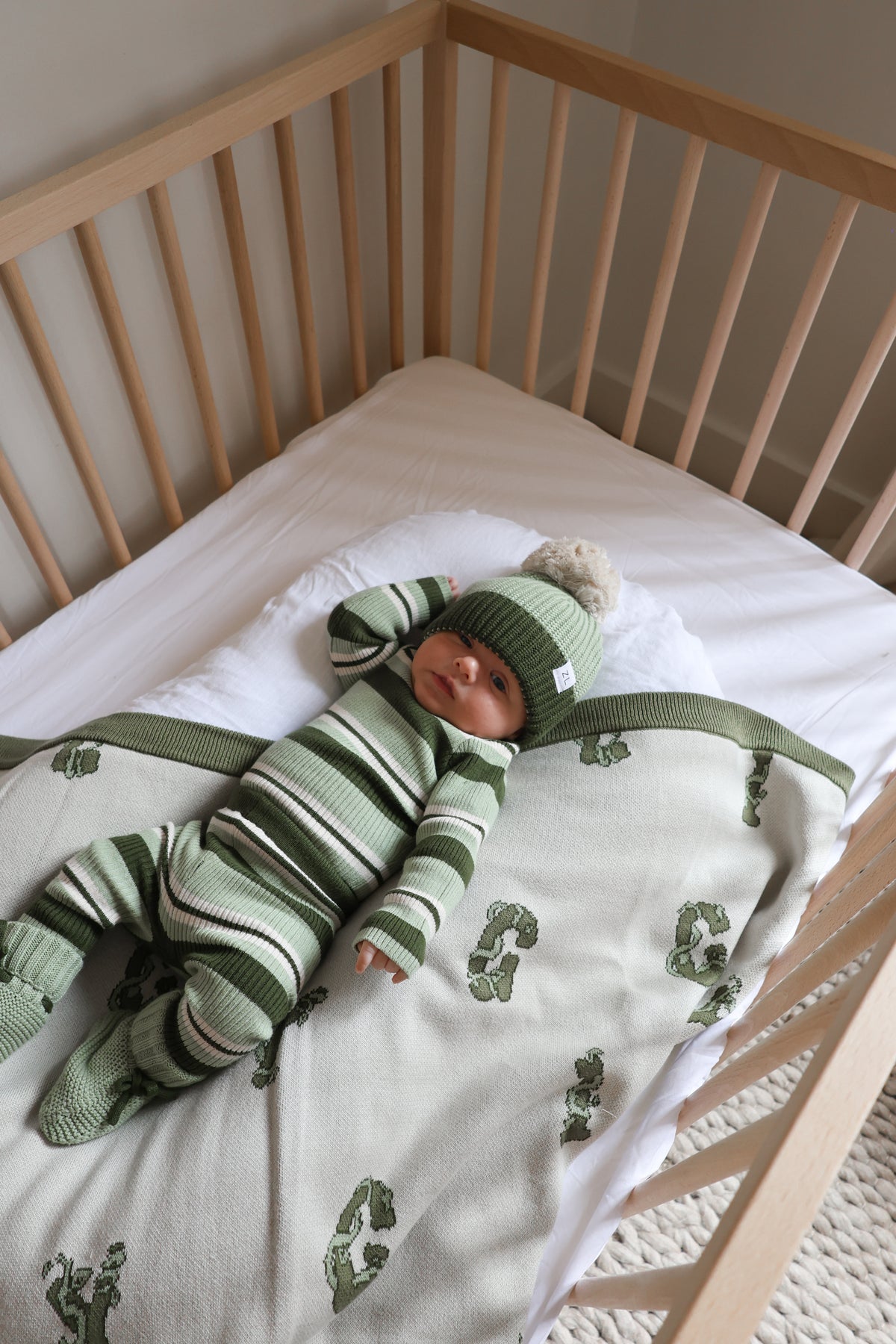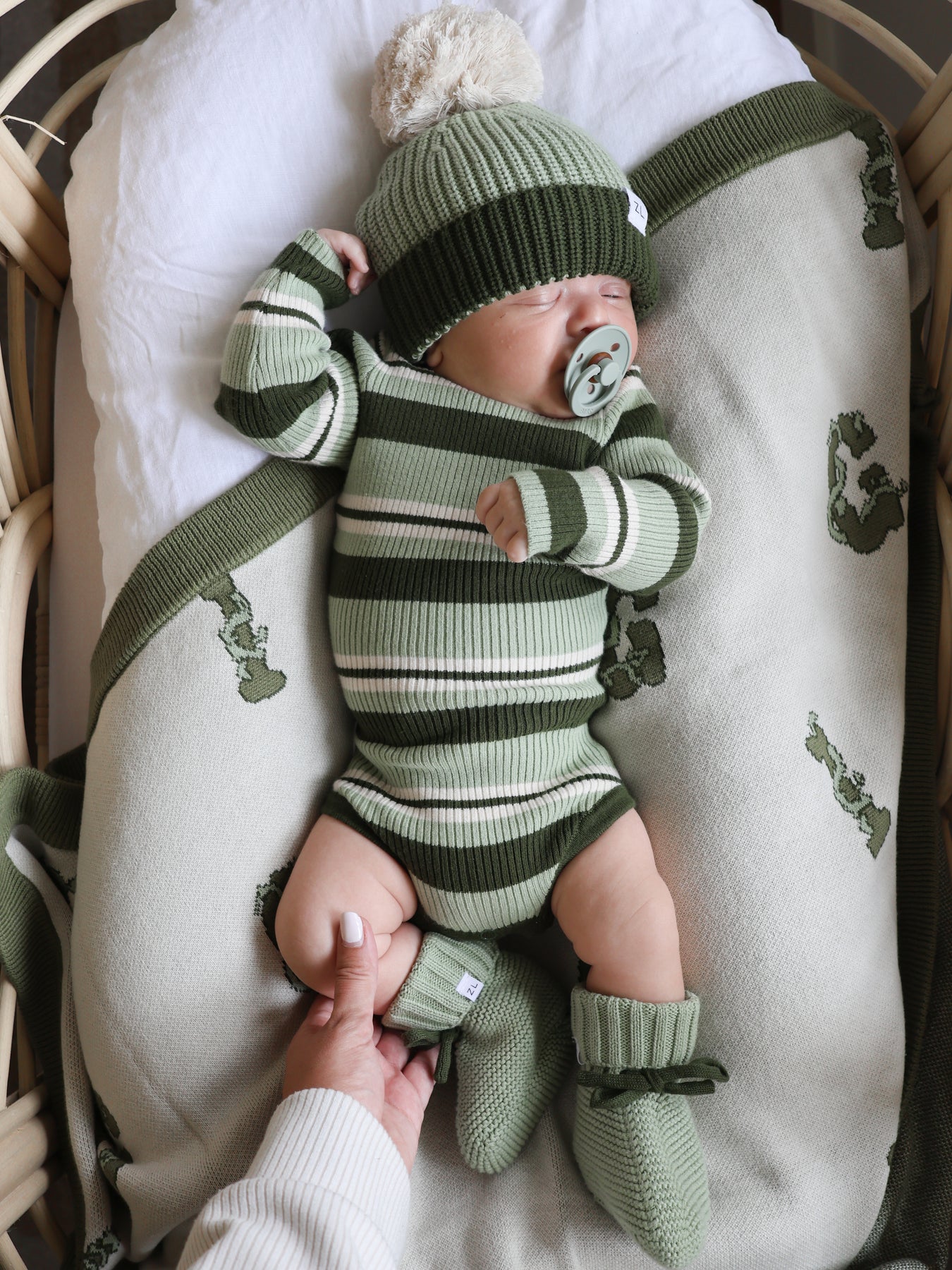 Ribbed, long sleeve, bodysuit in our striped Basil colours. Functional press snaps at crotch for easy nappy changes and press snaps on shoulder for easy on/off. Pair with items from our Basil + Vines Collections.