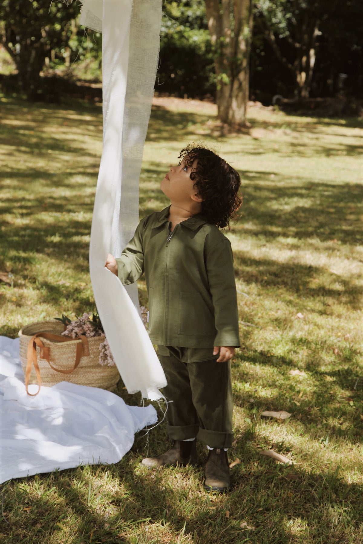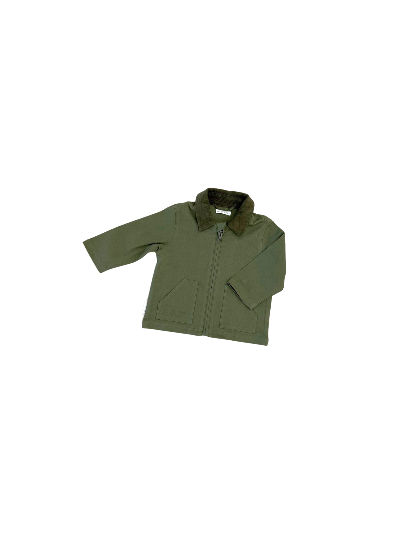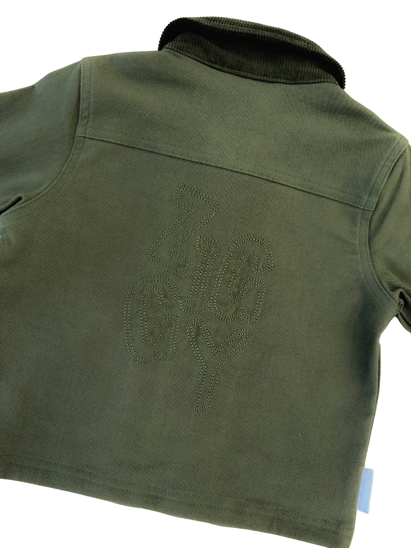 Canvas Jacket with a contrasting cord collar, two front pockets, and functional front zipper. Features embroidered detail on the back of the jacket and front pocket.
