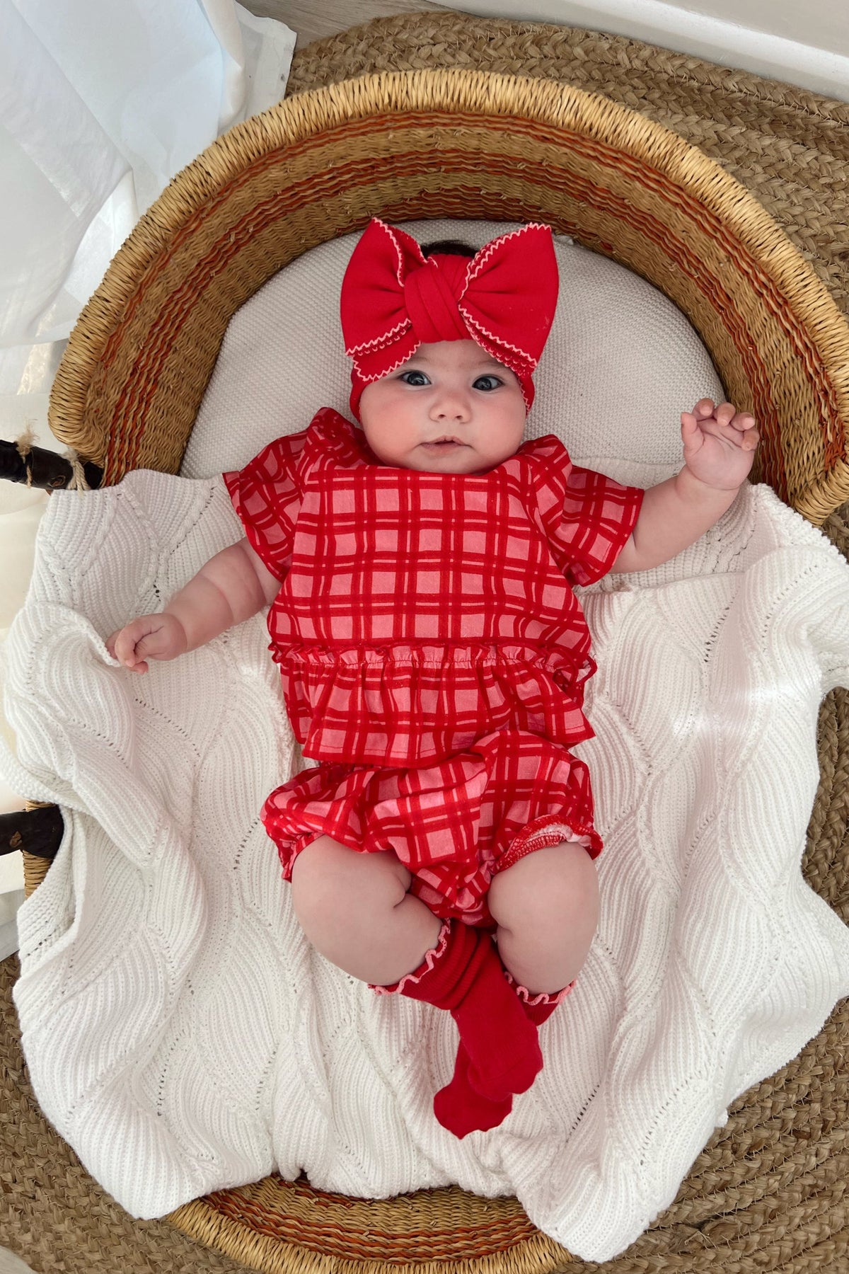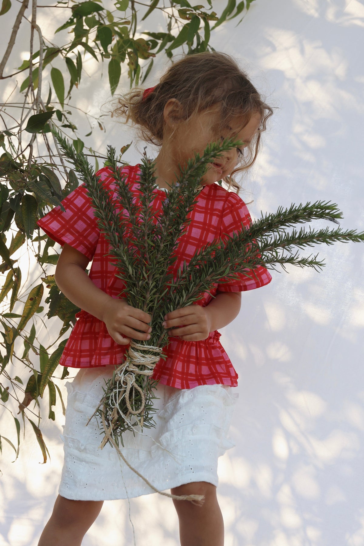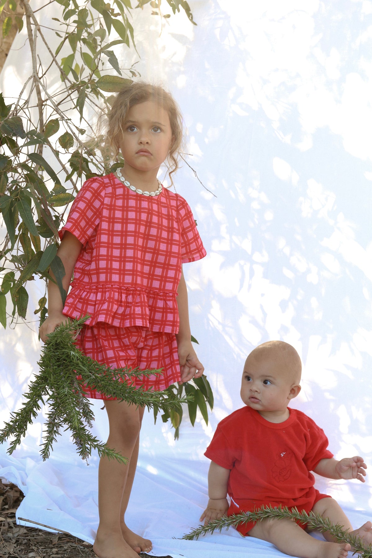 Cotton short sleeve top featuring our exclusive Jolie print. Functional button on the back of the neck for easy on/off, ruffle frill hem detail at waist. Mix and match with items from our Christmas Collection.