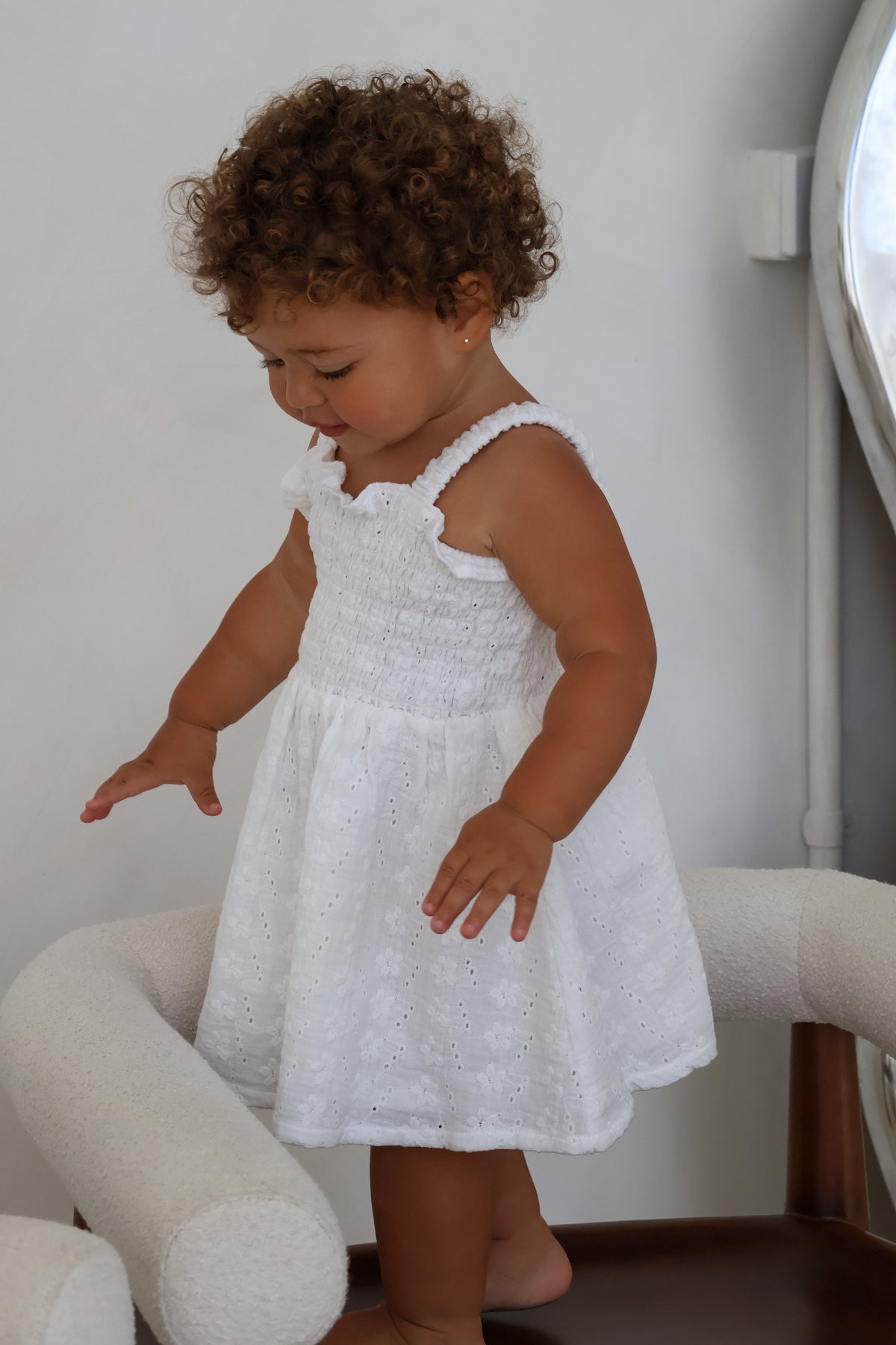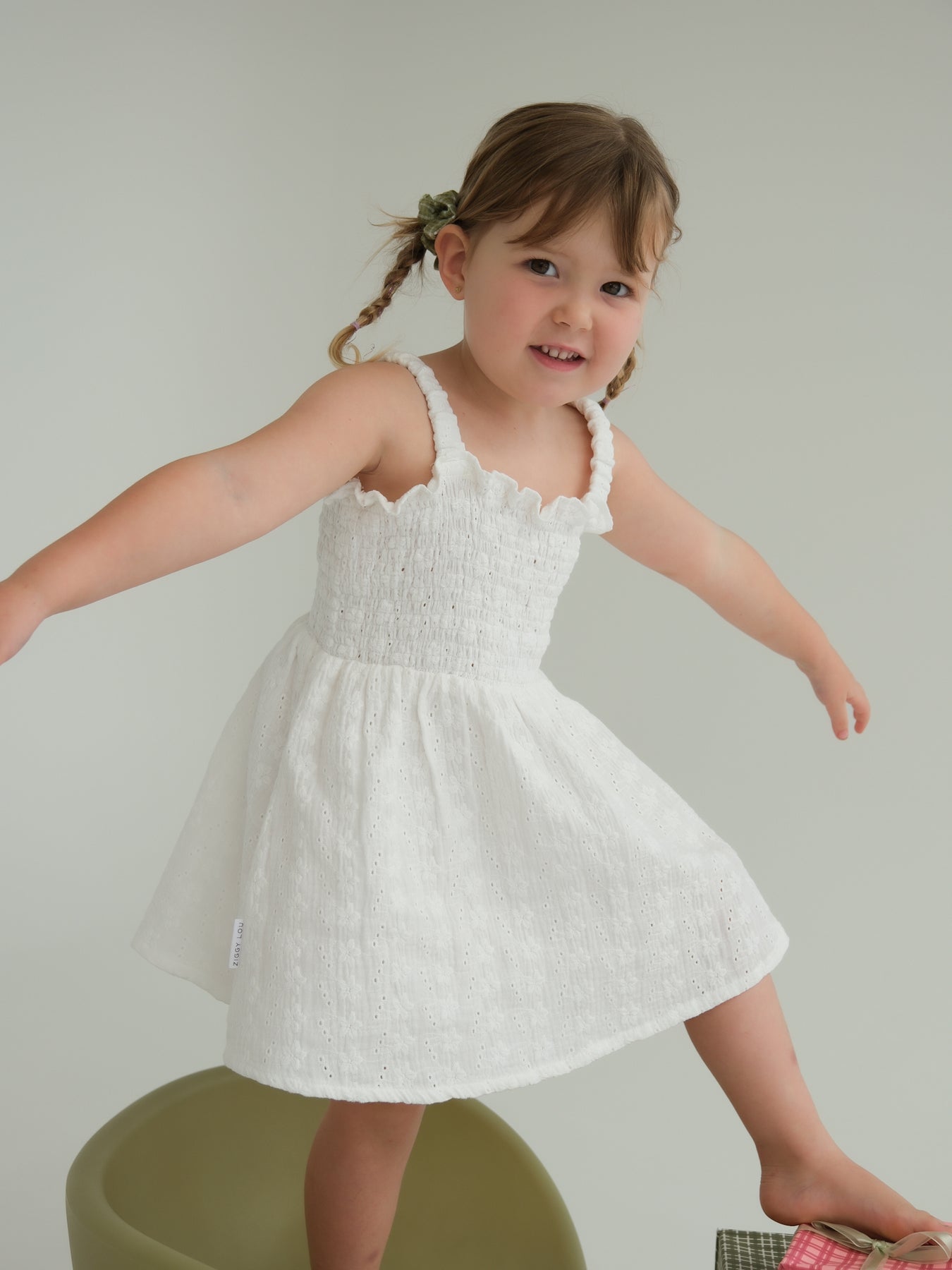 Cotton dress in our Laurel broderie anglaise fabric. Shirred bodice with adjustable button hole straps. Mix and match with items from our Christmas Collection.