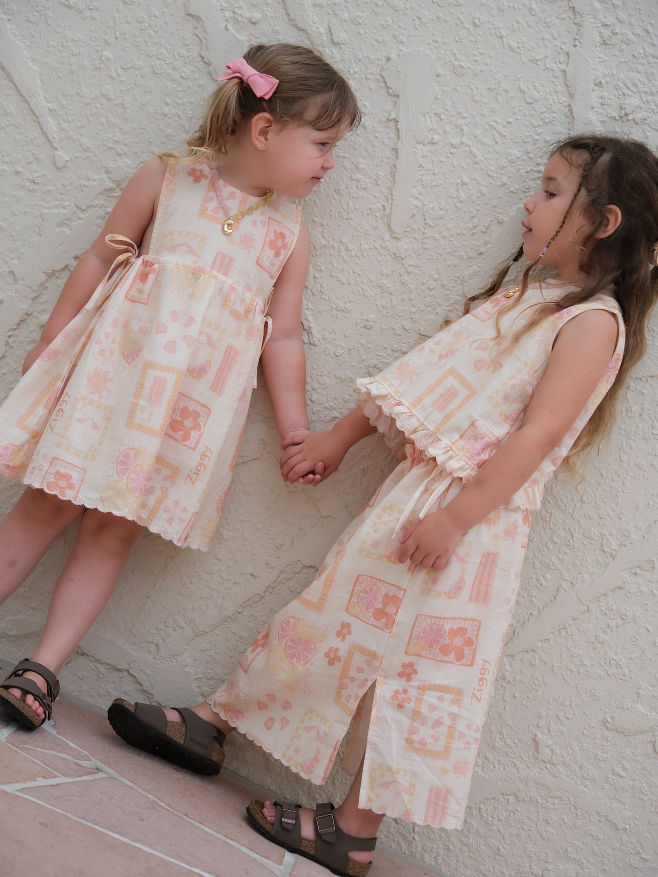 Cotton dress featuring our exclusive Cali print. Adjustable ties at waist and buttons on the back for easy on/off. Mix and match with items from our Cali Collection.