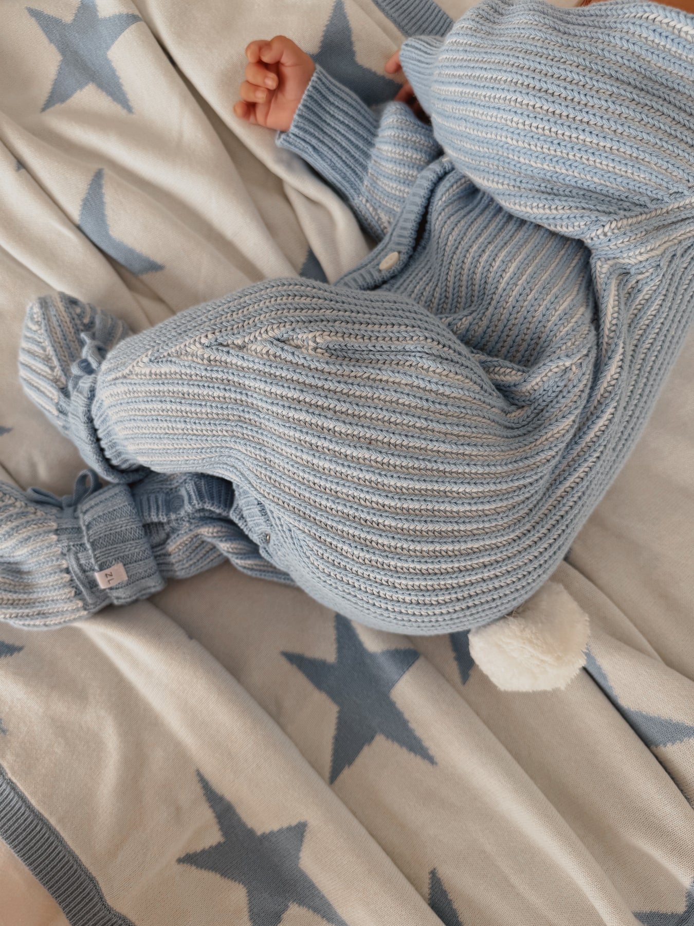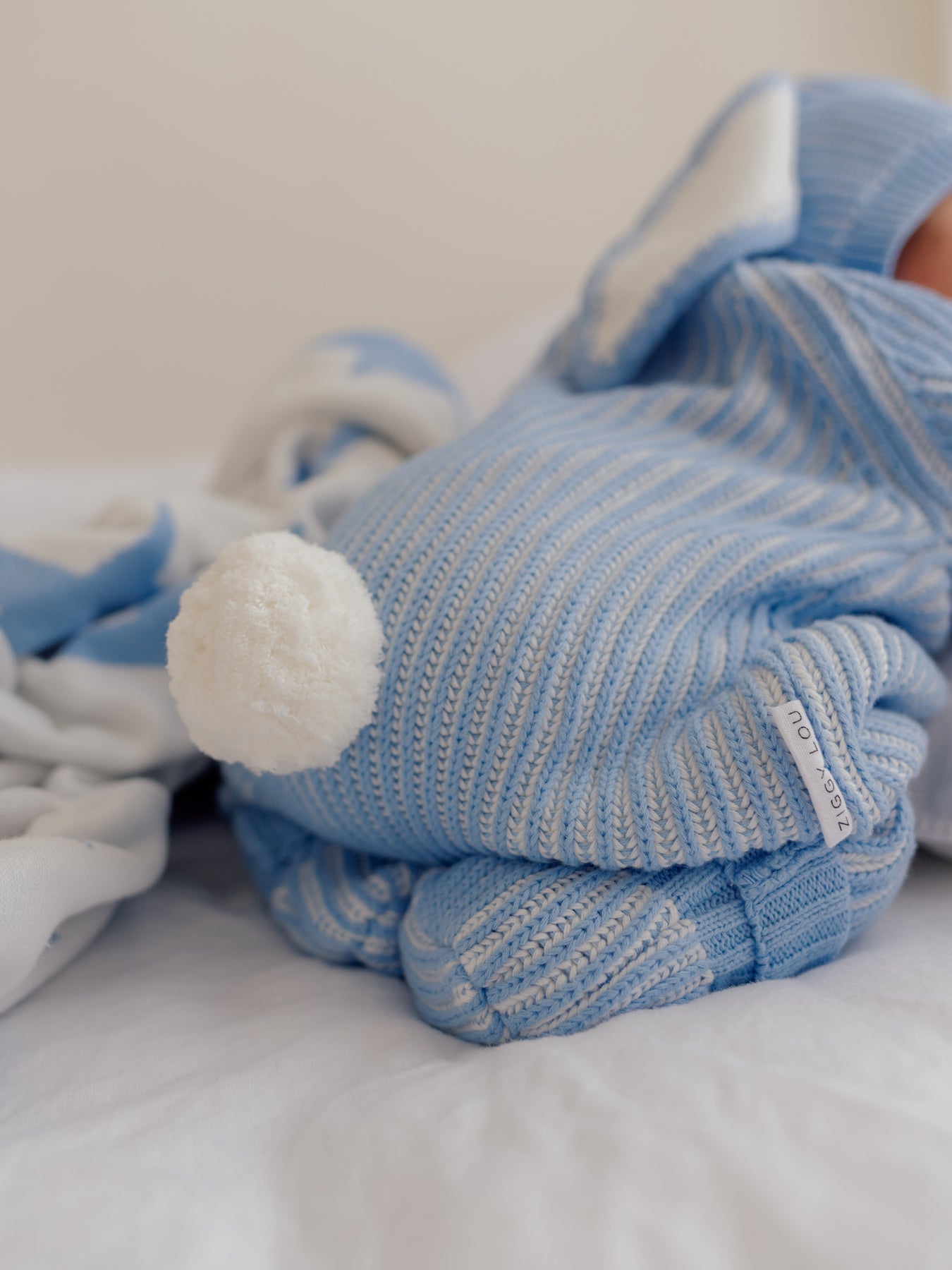 Braided classic knit romper in River + Milk colours featuring an adorable and removable bunny tail (press snap) Functional buttons down the front, snaps at crotch /leg for easy nappy changes and on/off. Pair with our Beau accessories for the perfect outfit.