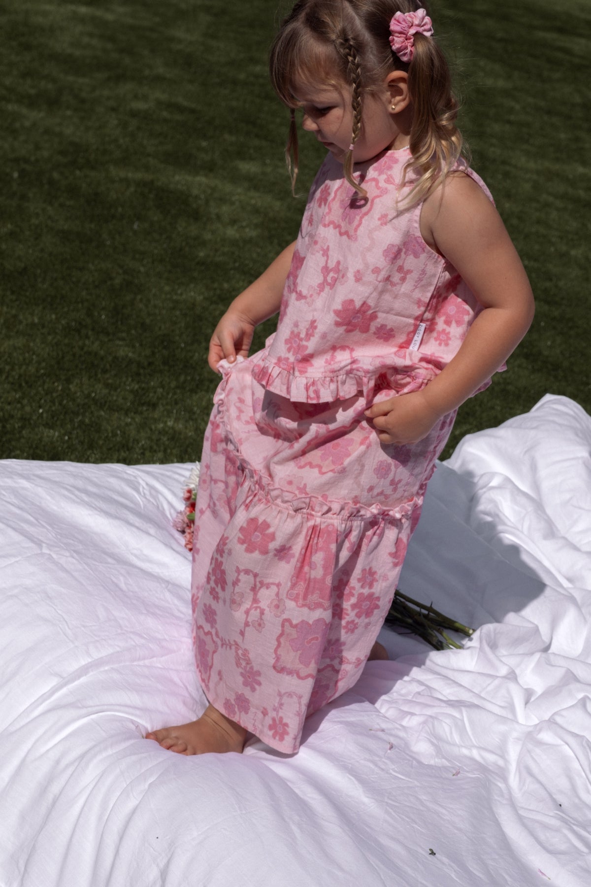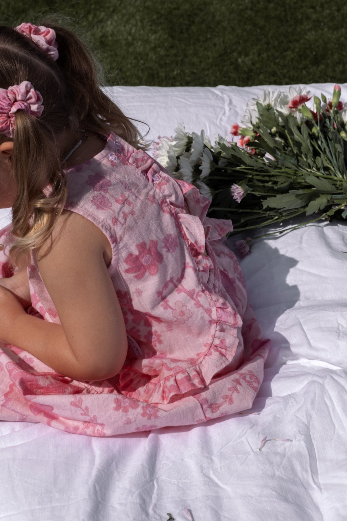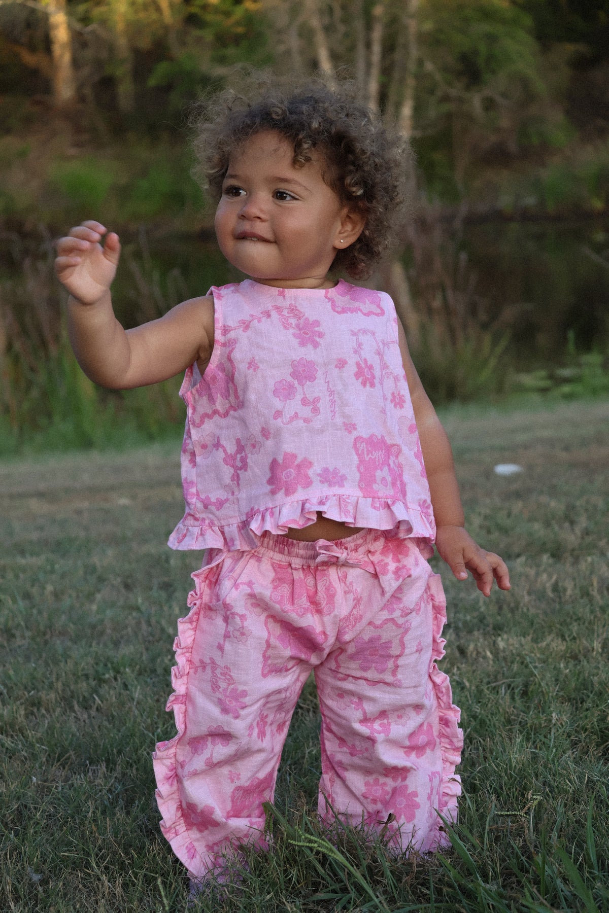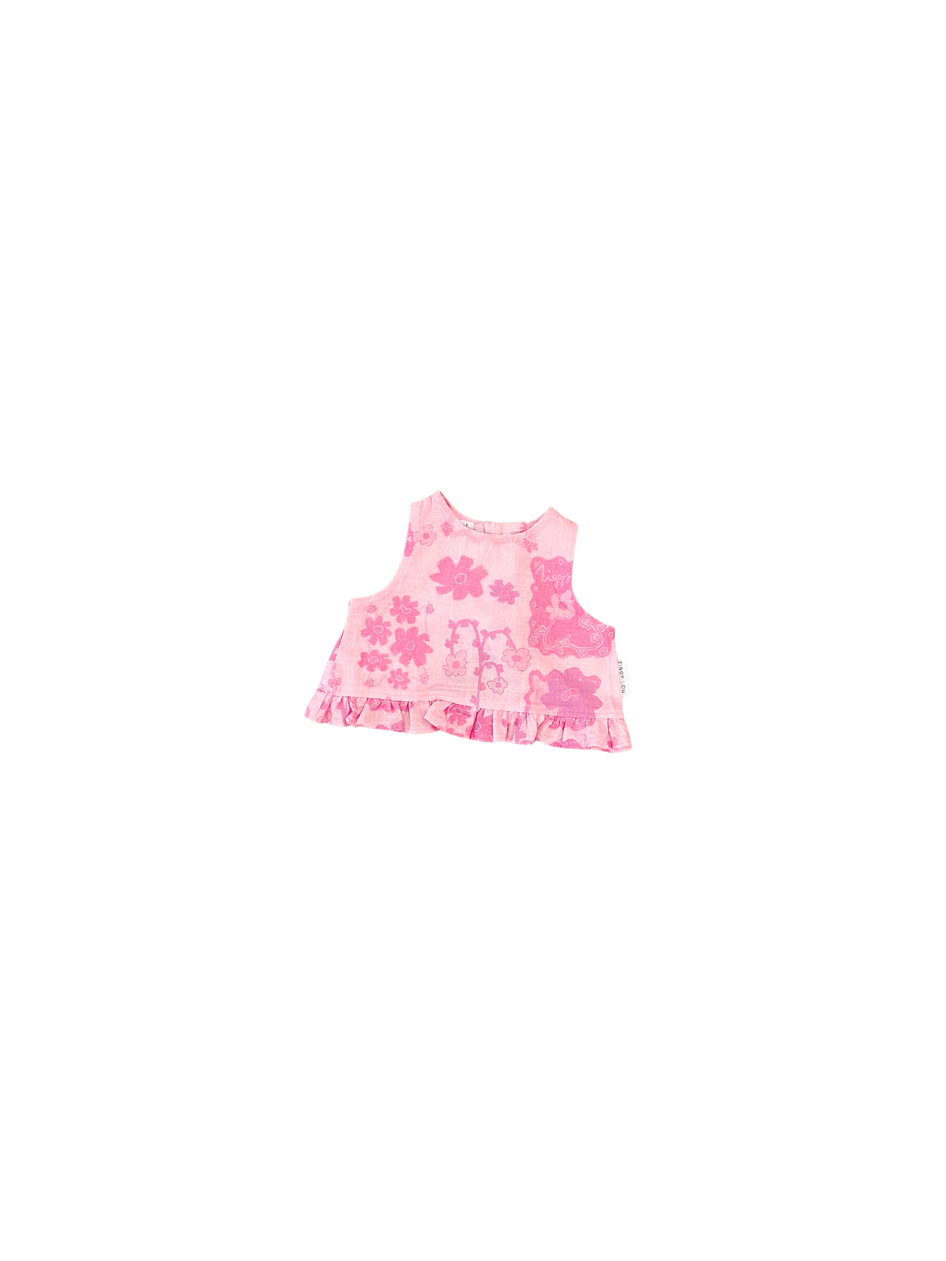Cotton singlet featuring our Elora printed design. A frill hemmed swing top design at the back with two functional buttons at back of neck for easy on/off. Mix and match with items from our Elora Collection.