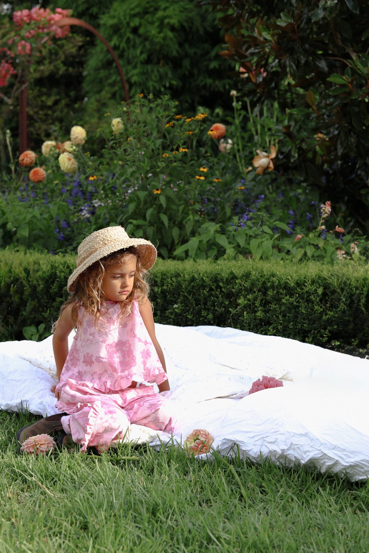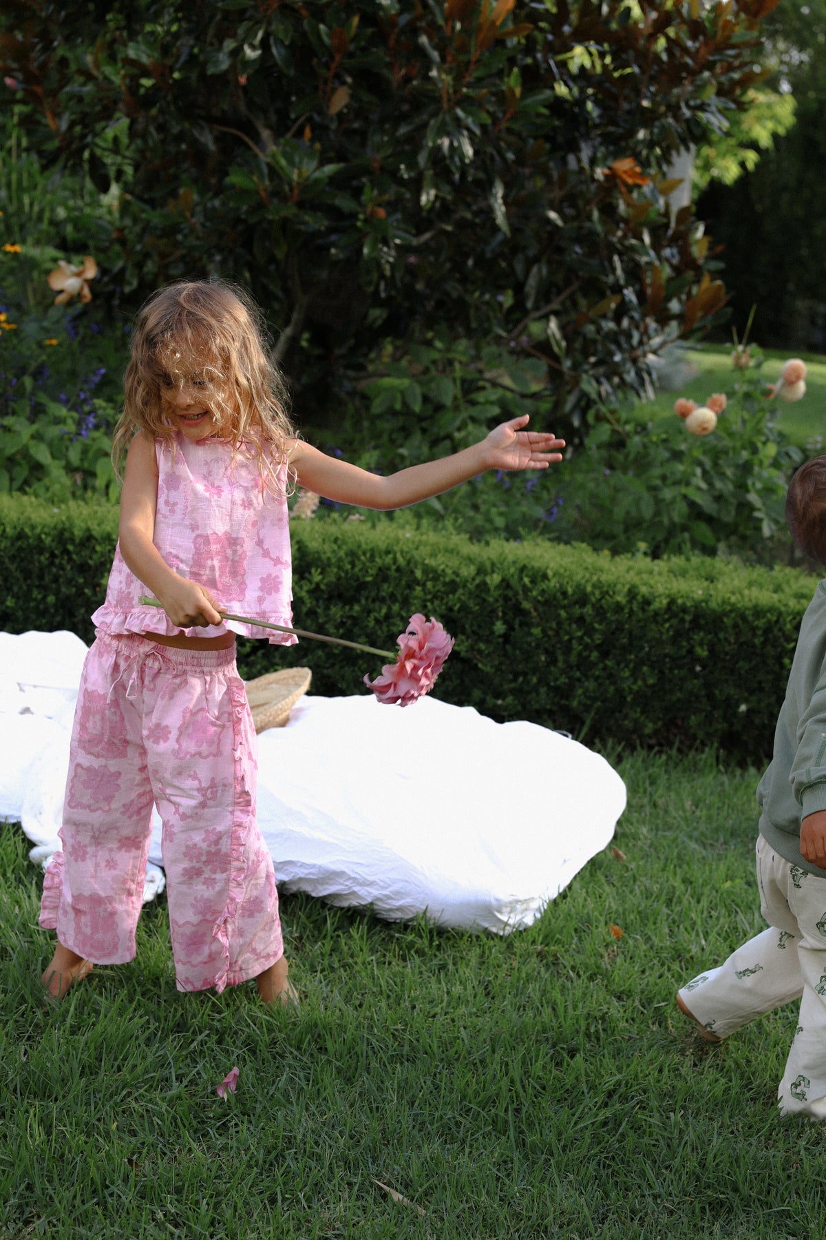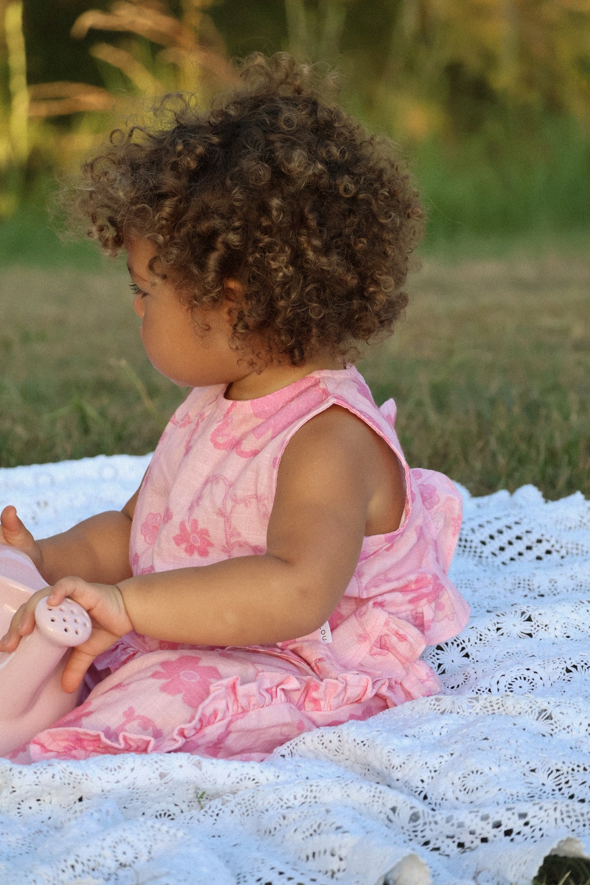 Cotton singlet featuring our Elora printed design. A frill hemmed swing top design at the back with two functional buttons at back of neck for easy on/off. Mix and match with items from our Elora Collection.