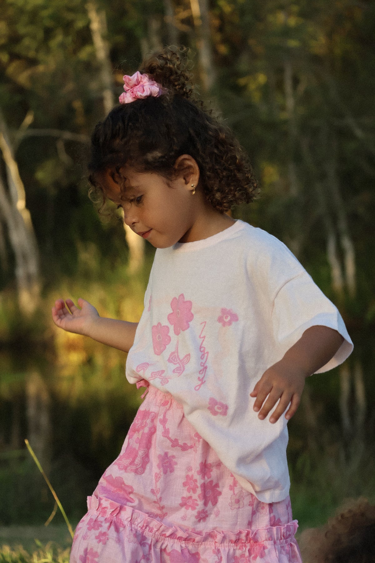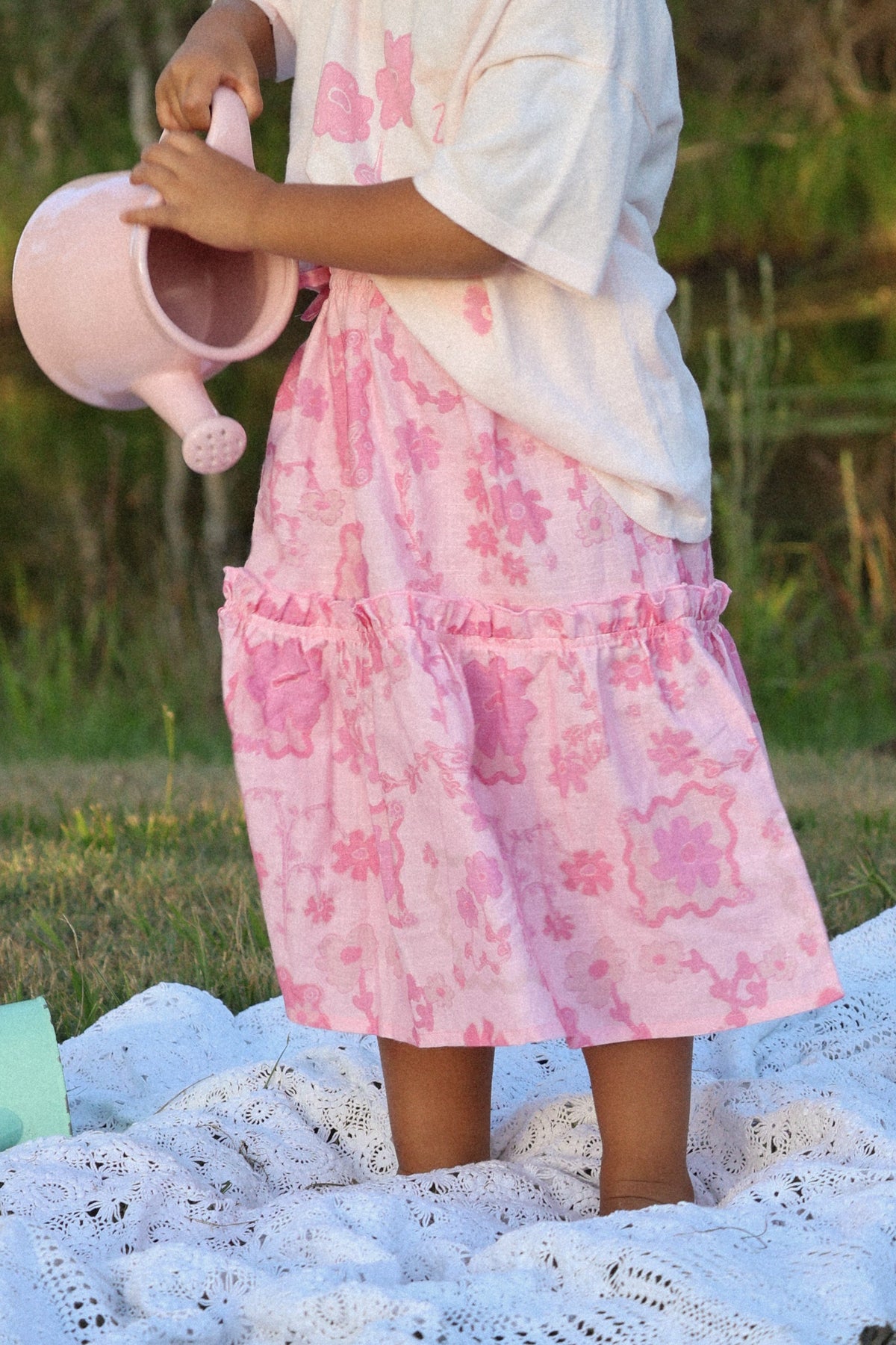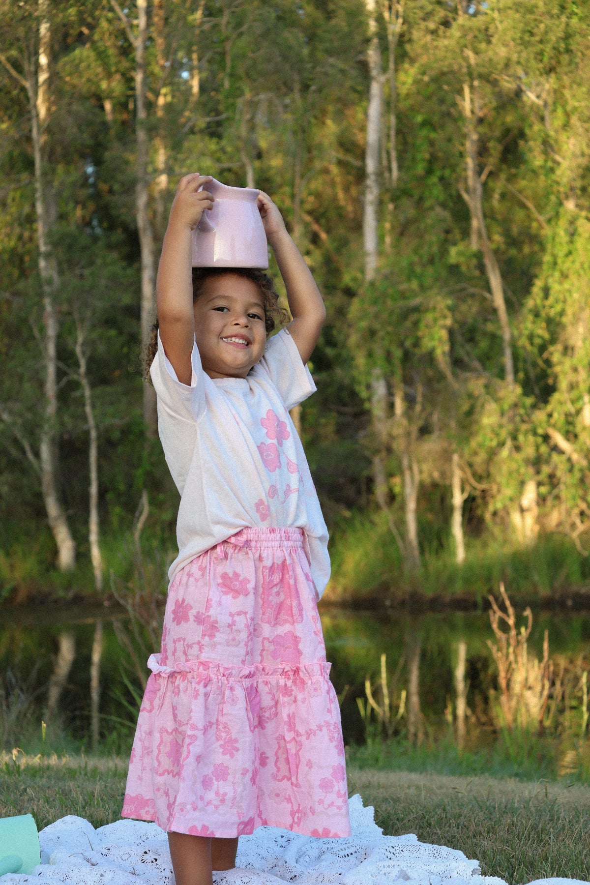 Lightweight, long cotton tiered skirt featuring our Elora print. Small side splits on either side and adjustable ties on each side of the soft elastic waist to create the perfect fit. Mix and match with items from our Elora + Sadie Collections.