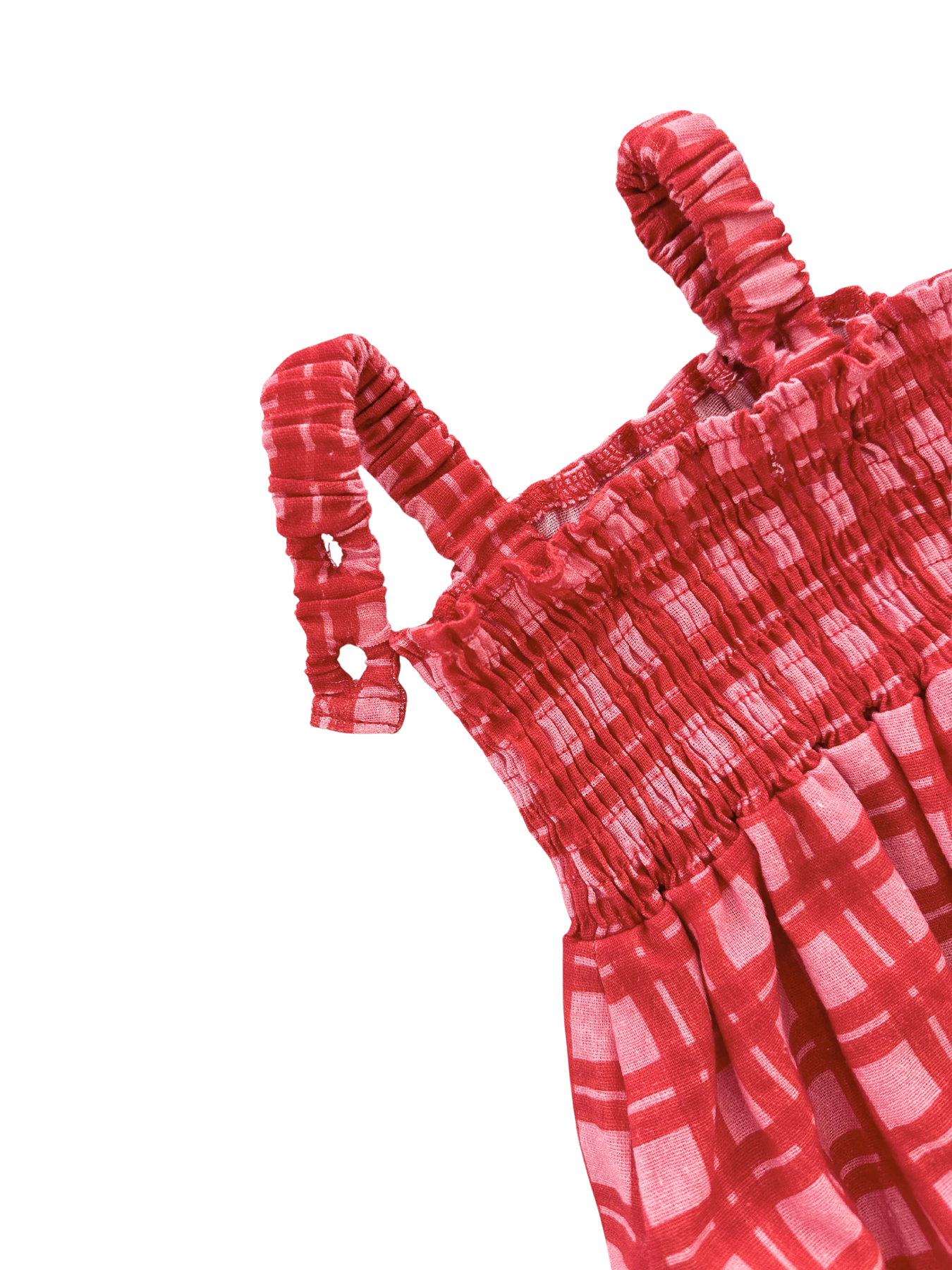 A lightweight cotton romper in our exclusive Jolie print. Shirred detailing across the bodice with adjustable button straps at back and snaps at the crotch for easy on/off and nappy changes. Mix and match with items from our Christmas Collection.