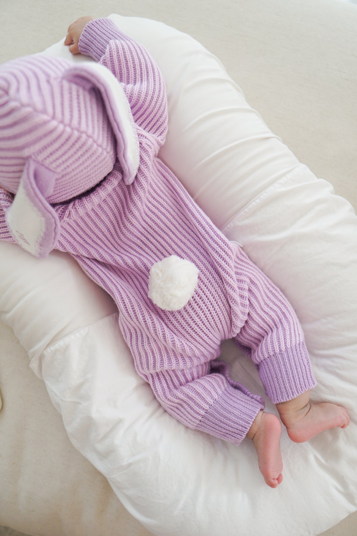 Braided classic knit romper in our Elowen + Lilac colours features an adorable and removable bunny tail (press snap) Functional buttons down the front, snaps at crotch /leg for easy nappy changes and on/off. Pair with our Lily or Cassia items for the perfect outfit.