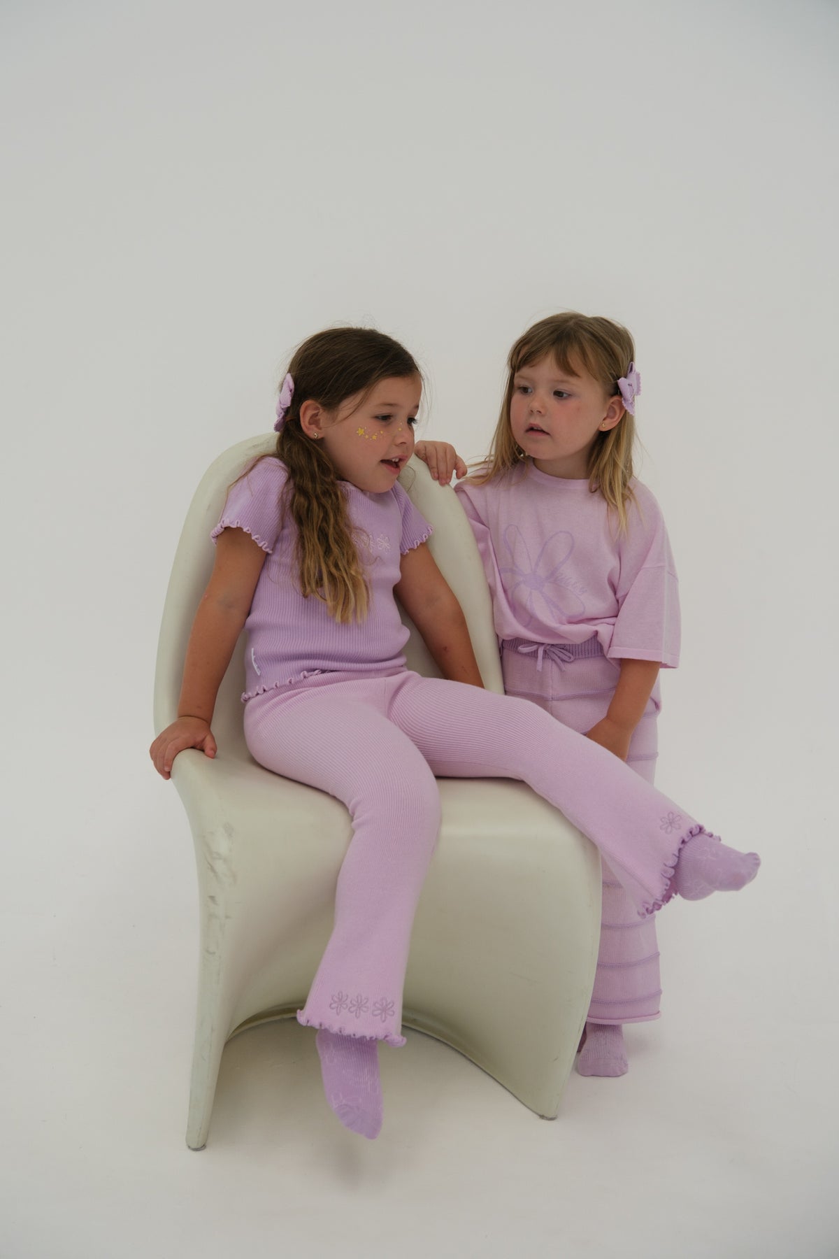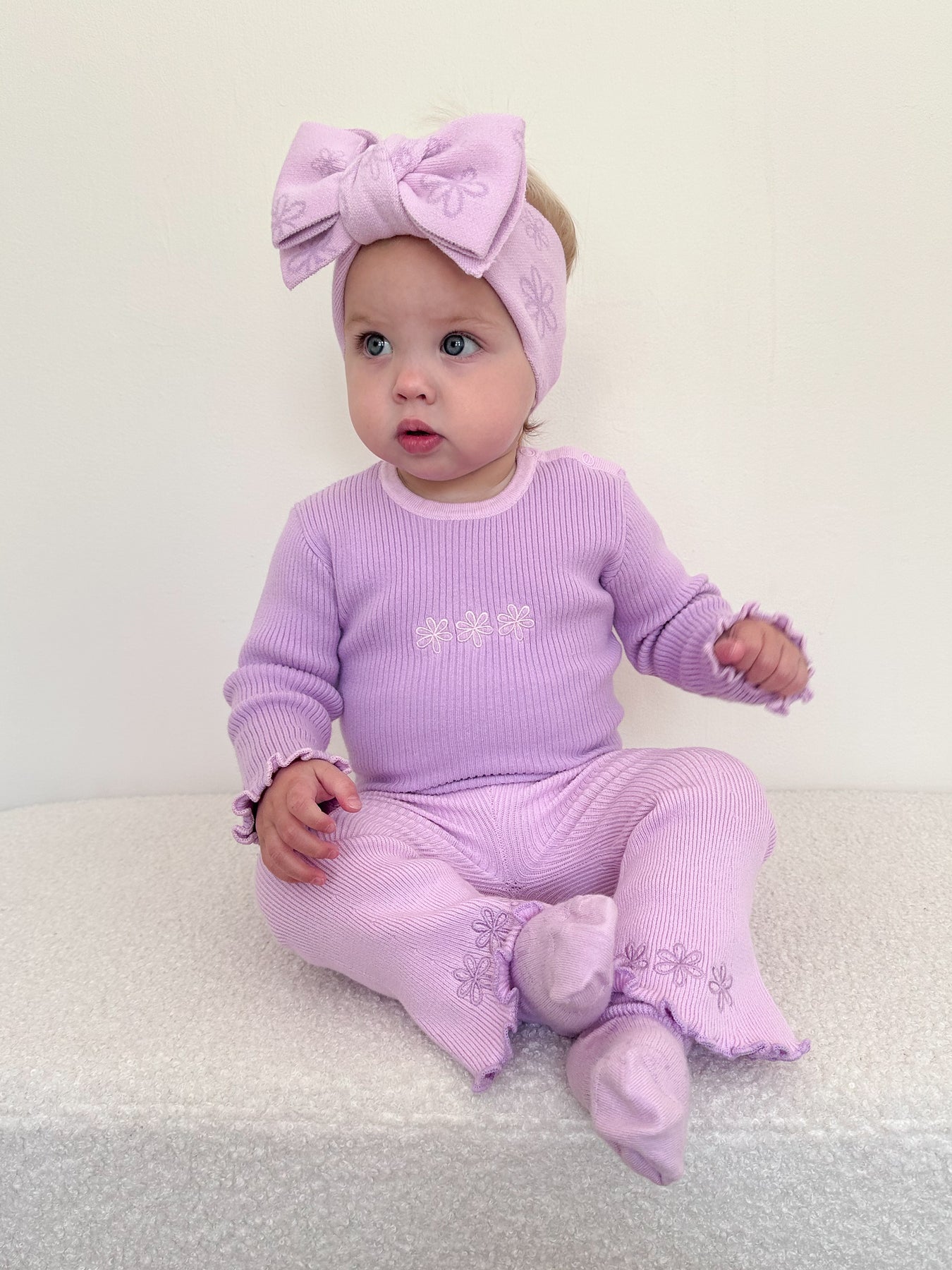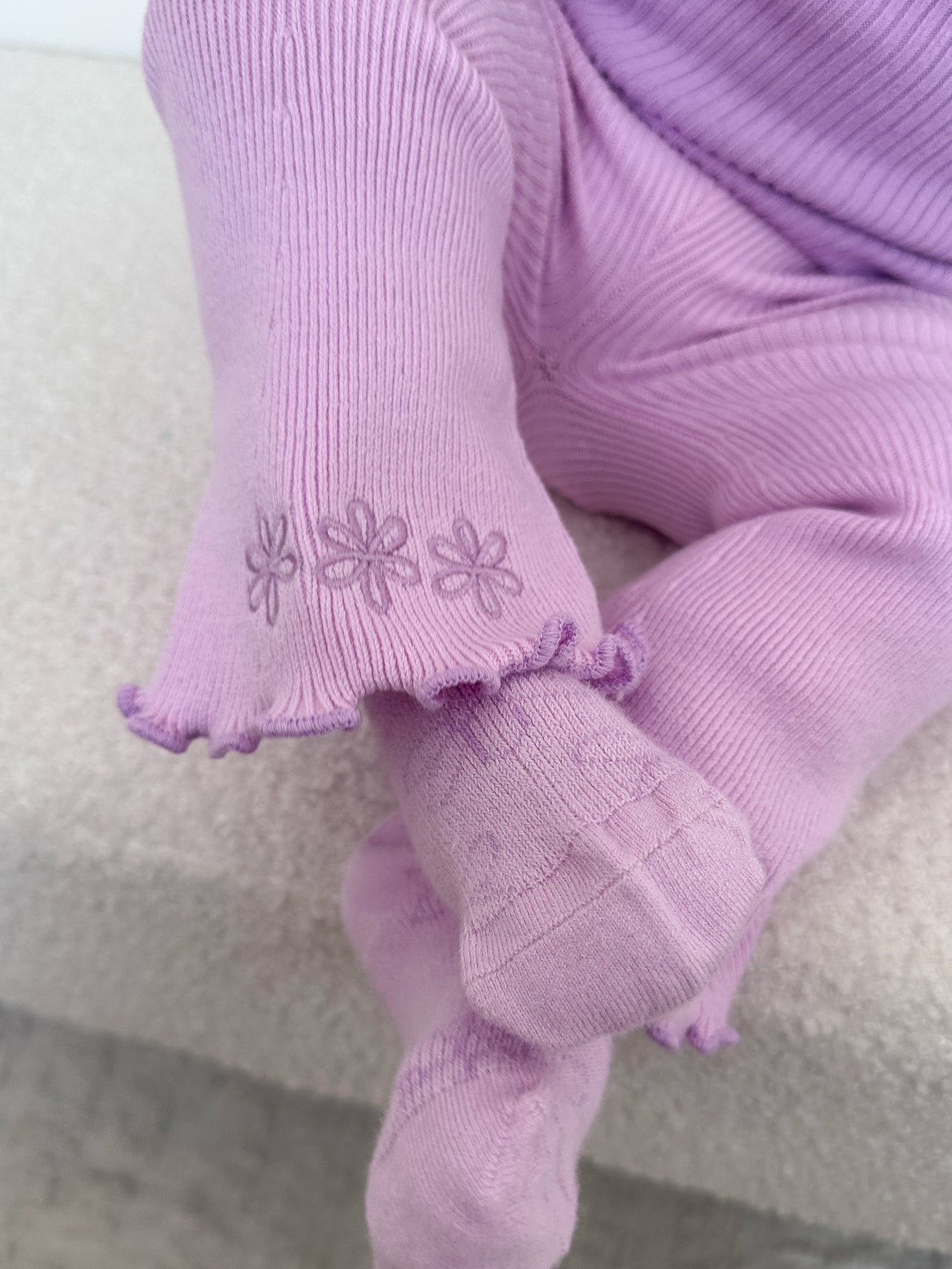 Knitted ribbed leggings with flared bottoms. Featuring embroidered Cassia flowers on each leg. Mix and match with Elowen, Lilac + Cassia items.
