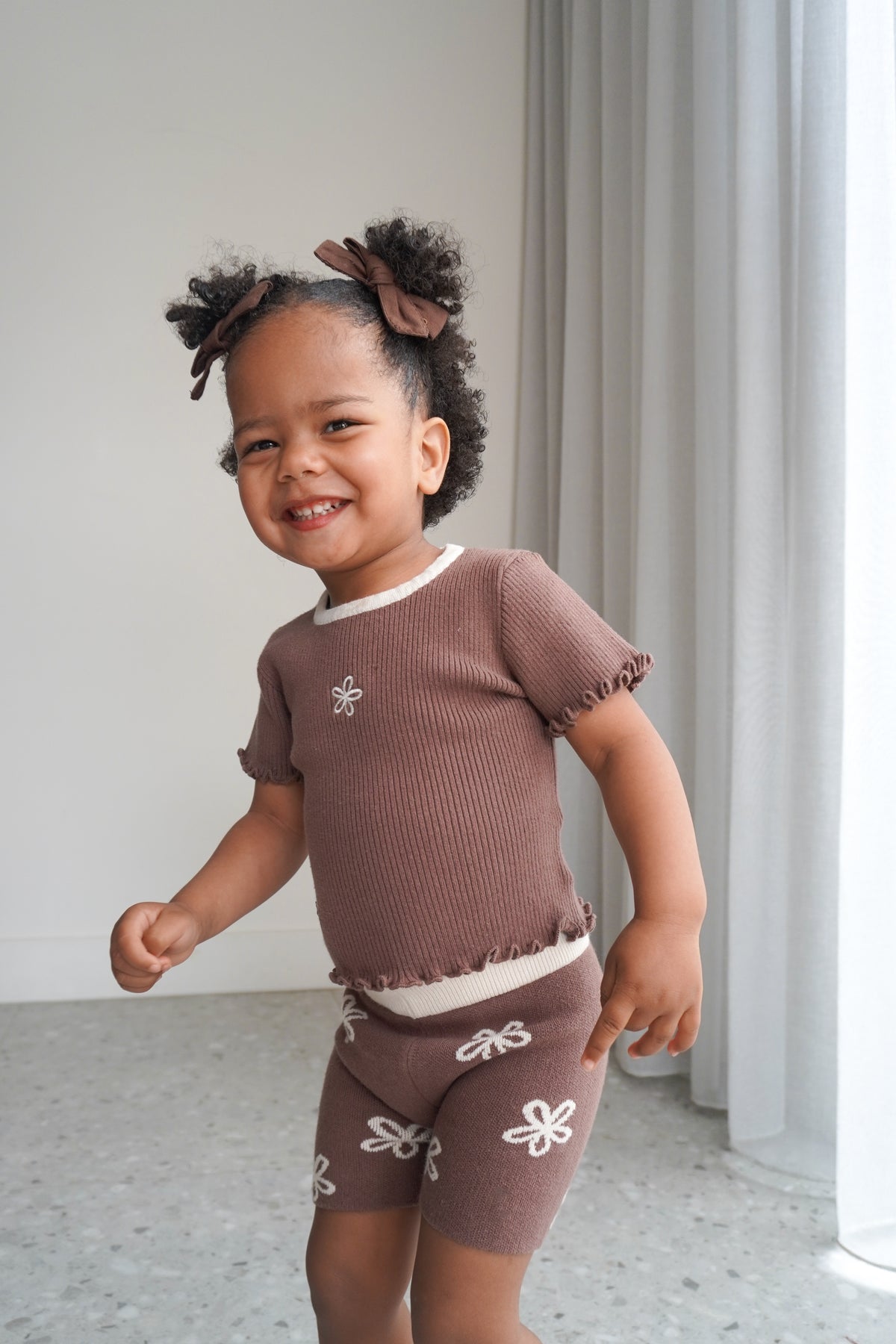 Jacquard knit bike shorts in our Clove colour featuring our Winnie floral design. A comfortable, stretchy fit with an elastic waist. Match with items from our Winnie + Scout Collections.