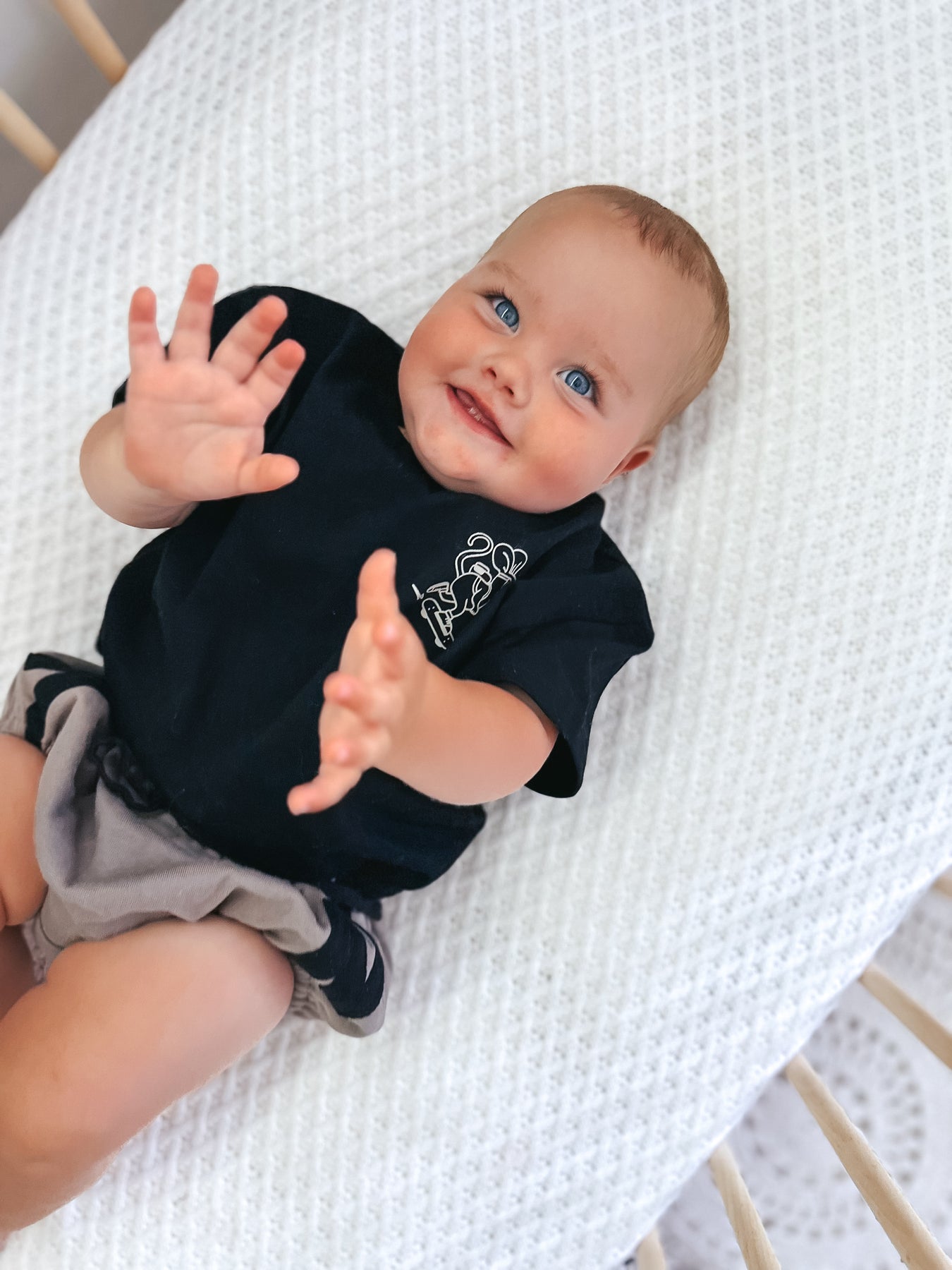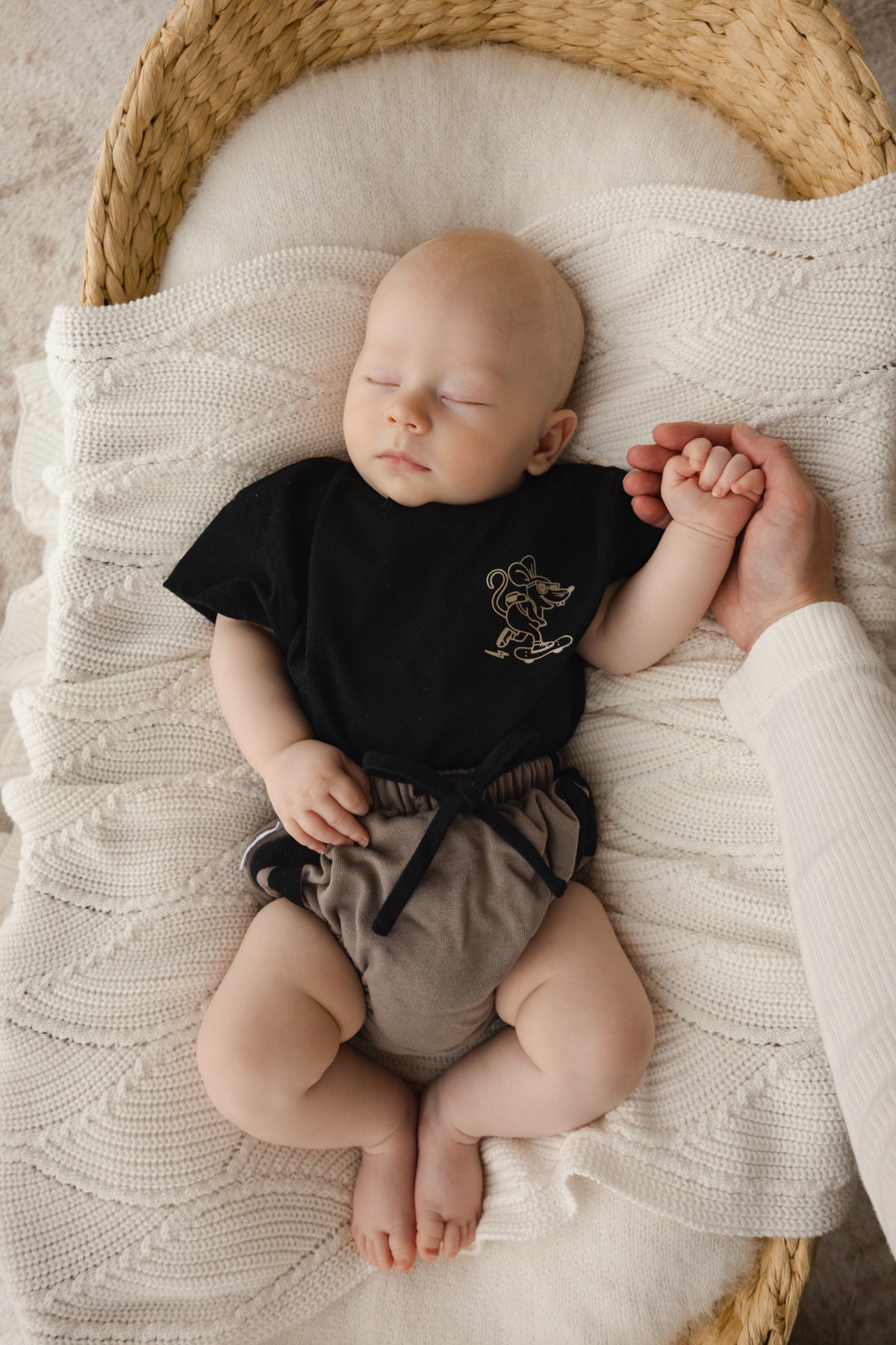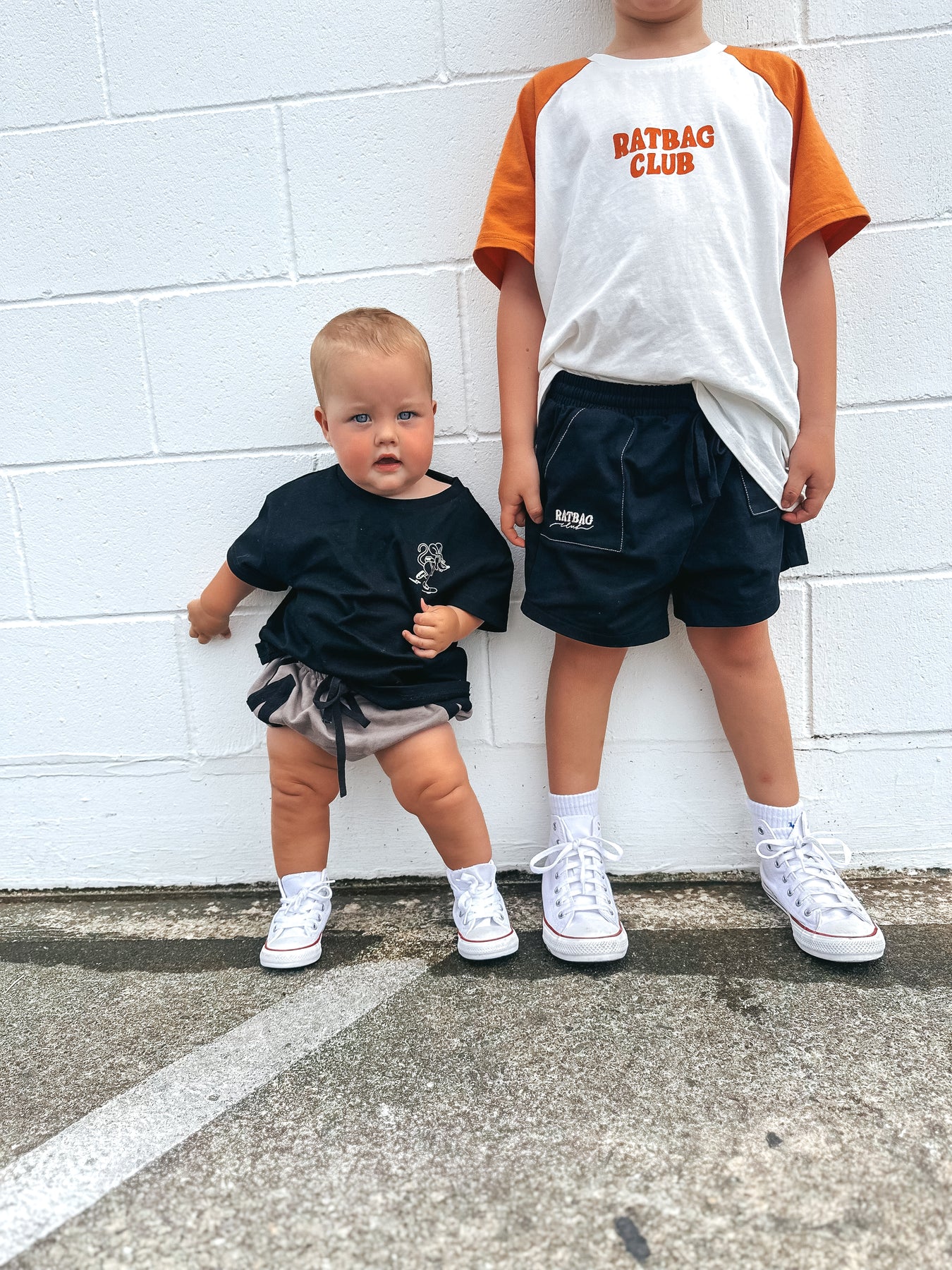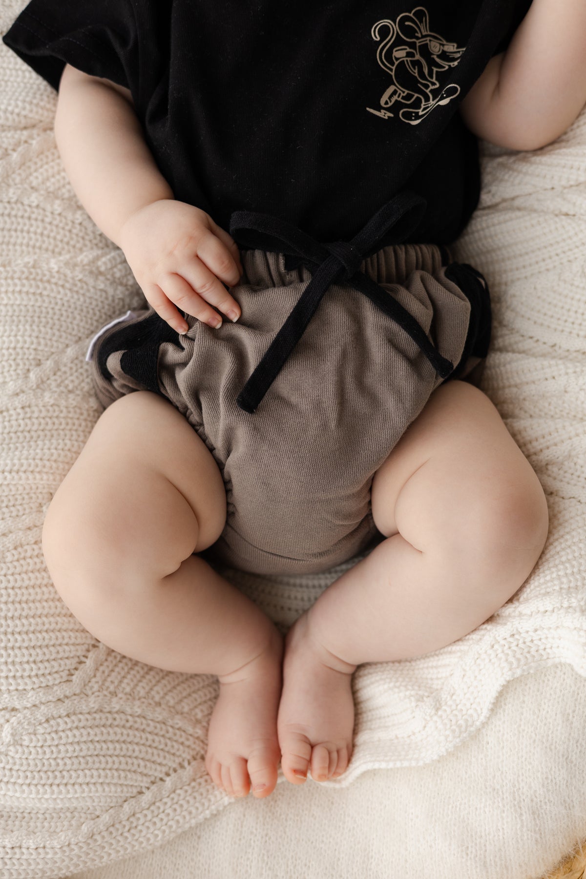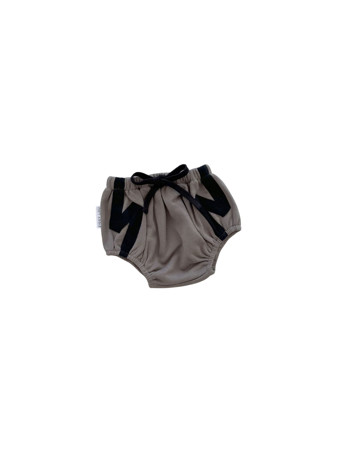 French Terry bloomers with an elastic waist + functional drawstring featuring lightning down each side. Mix and match with items from our Ratbag Collection.