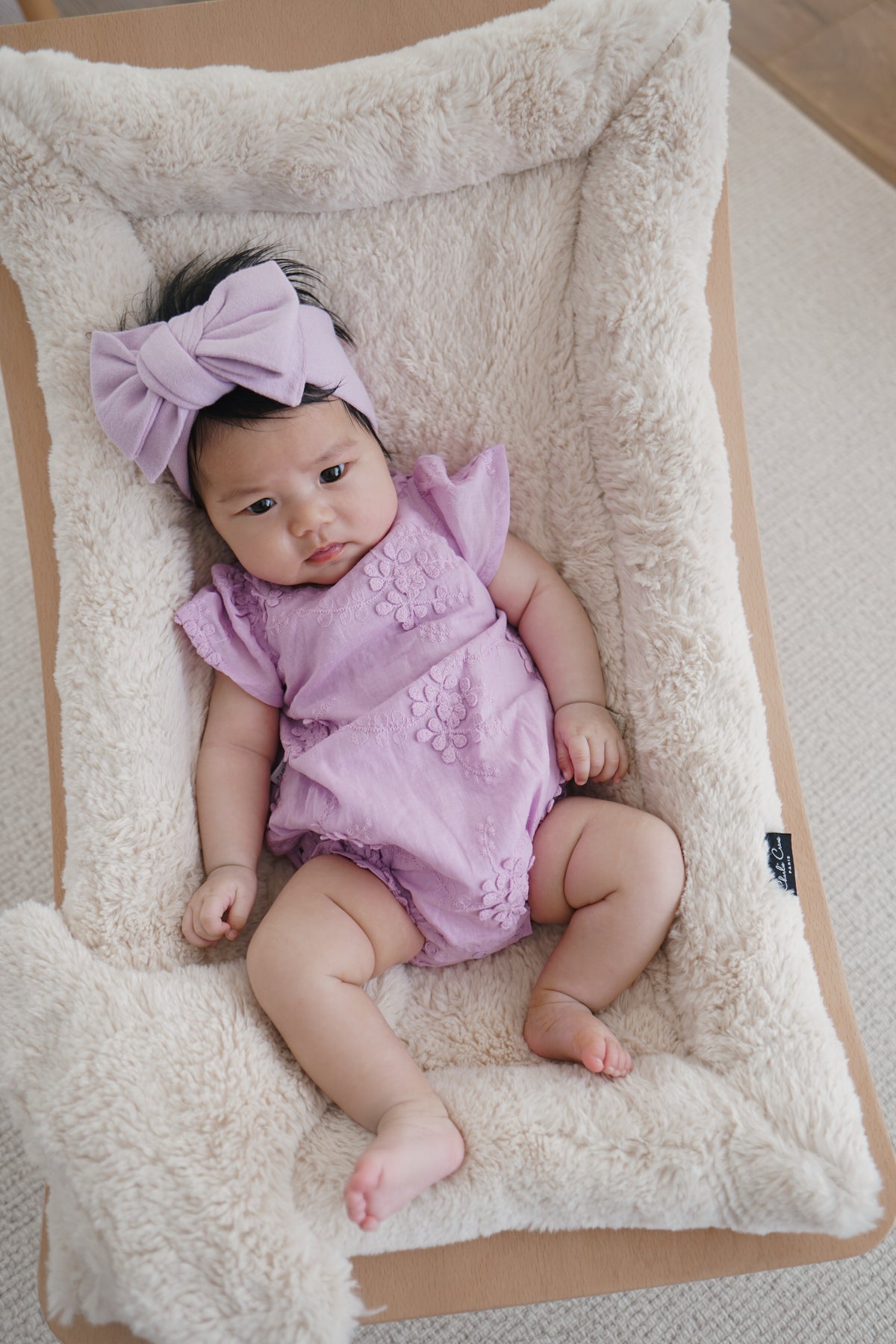 A lined lightweight cotton romper in our Laurel broderie anglaise fabric. Featuring flutter sleeves and a frill leg, snap buttons at back of the neck and the crotch for easy on/off and nappy changes. Mix and match with items from our Suki Collection.