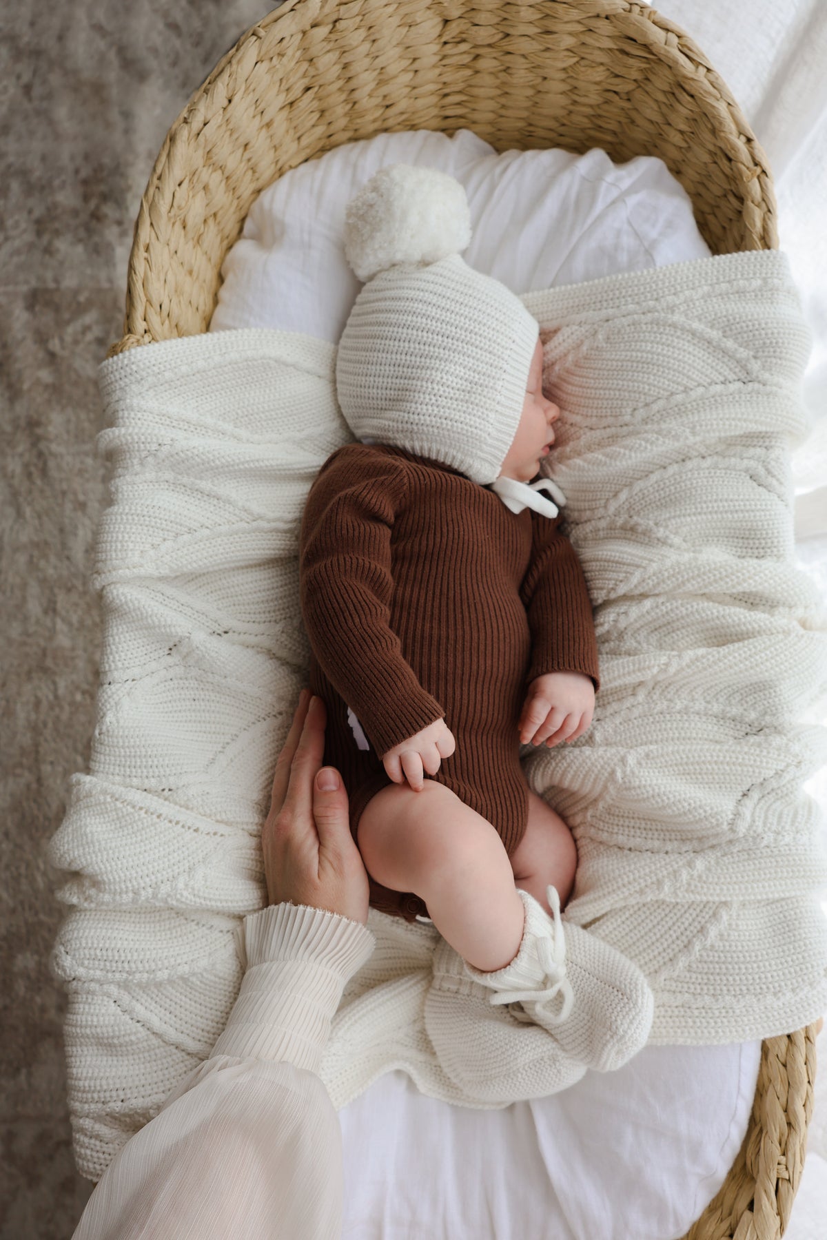 Ribbed, long sleeve, bodysuit. Functional press snaps at crotch for easy nappy changes and press snaps on shoulder for easy on/off. Matches perfectly with our chocolate leggings.