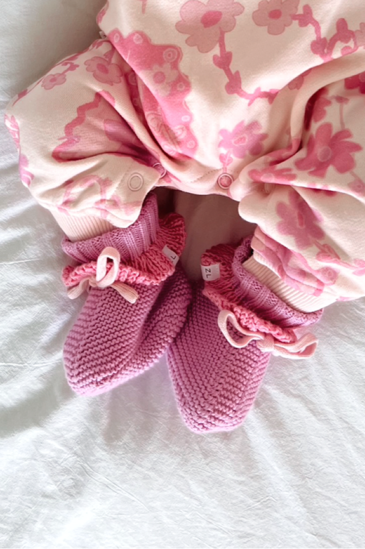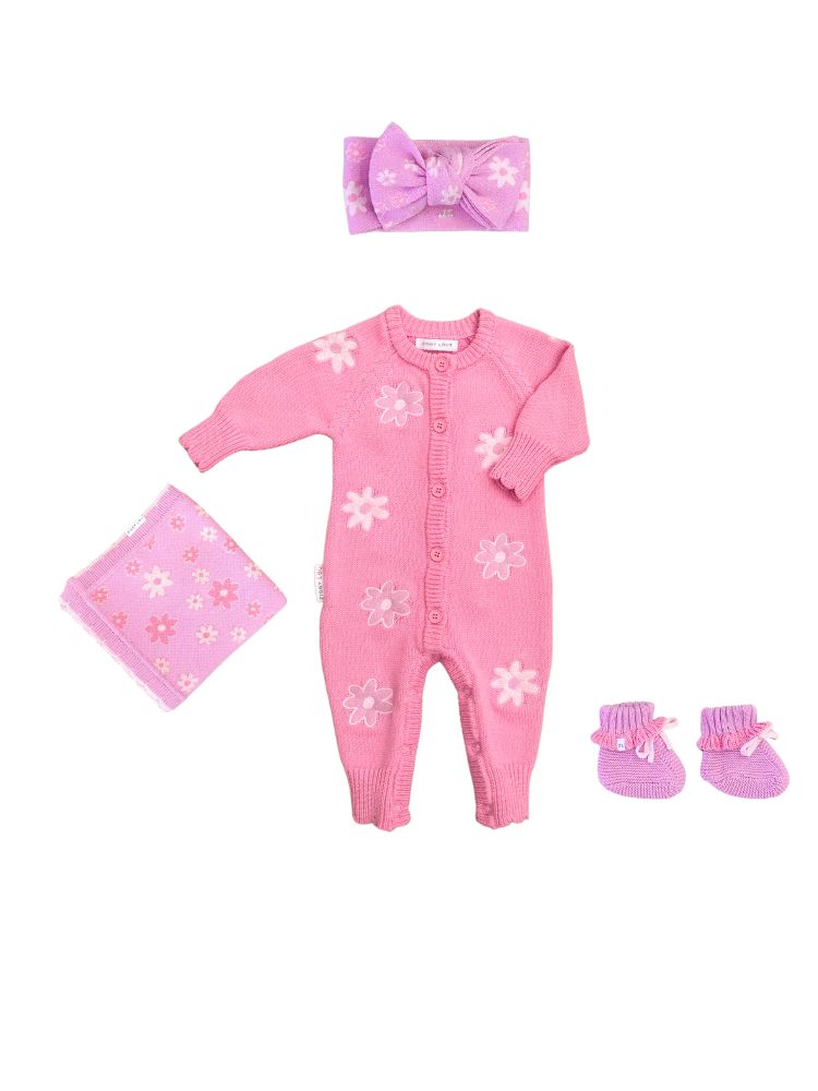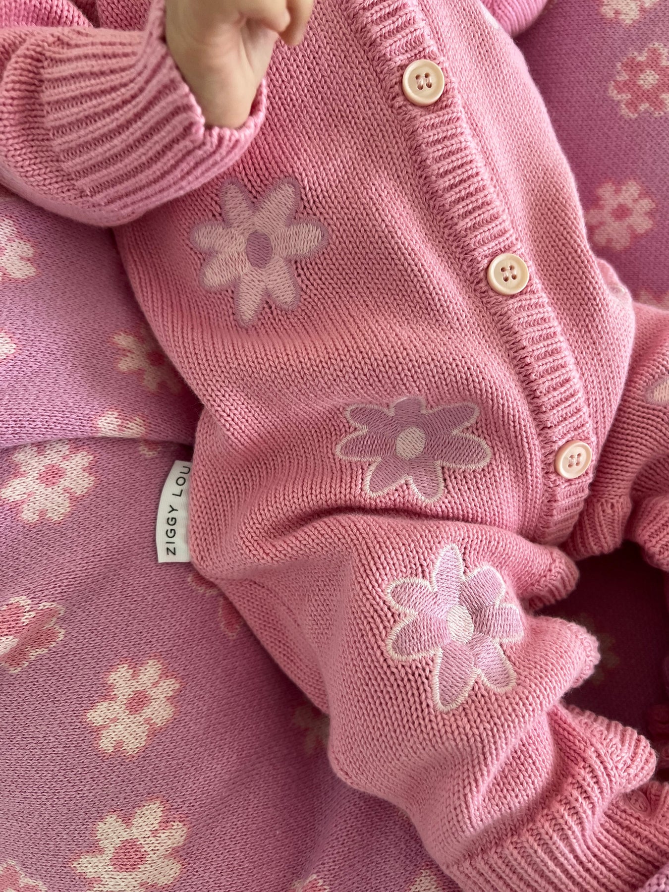 Our knitted romper features our embroidered Milla floral design and scalloped cuffs.