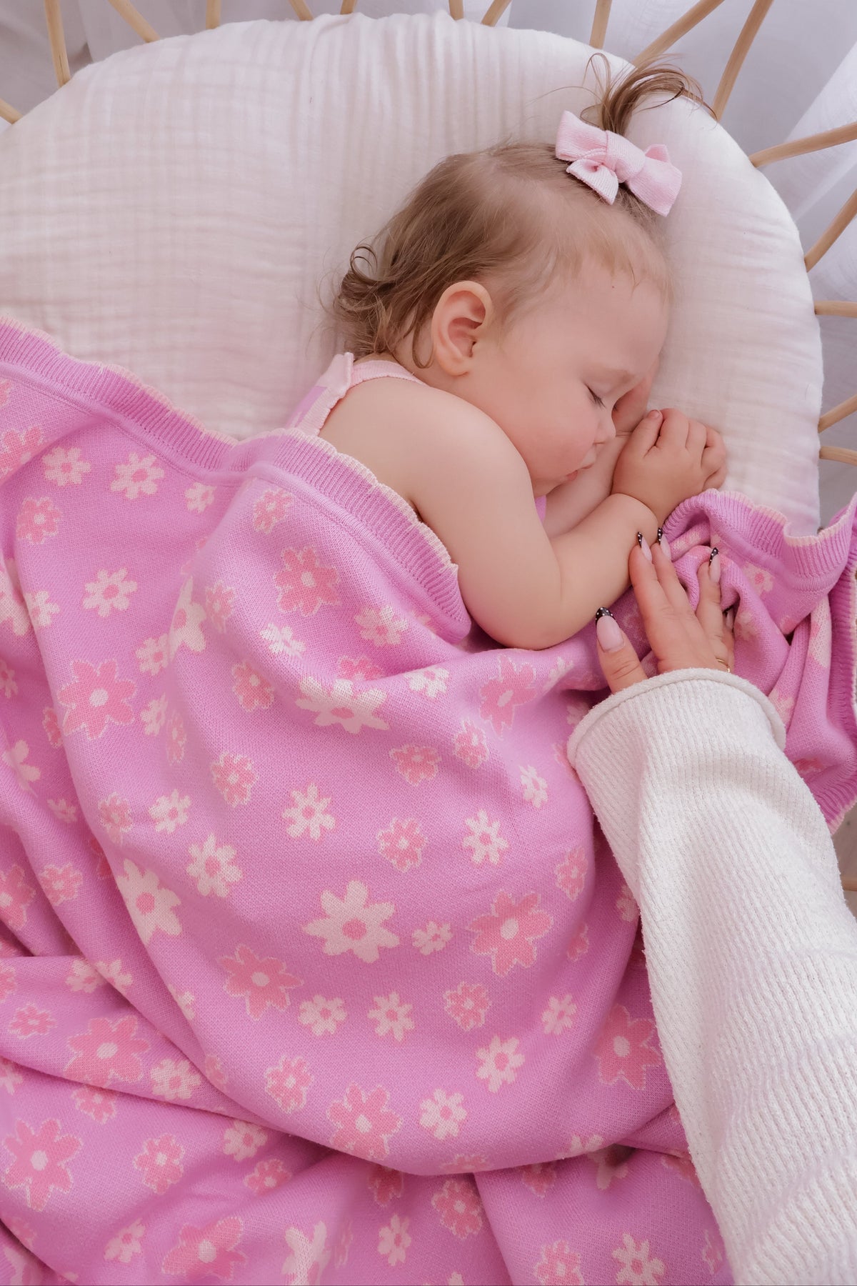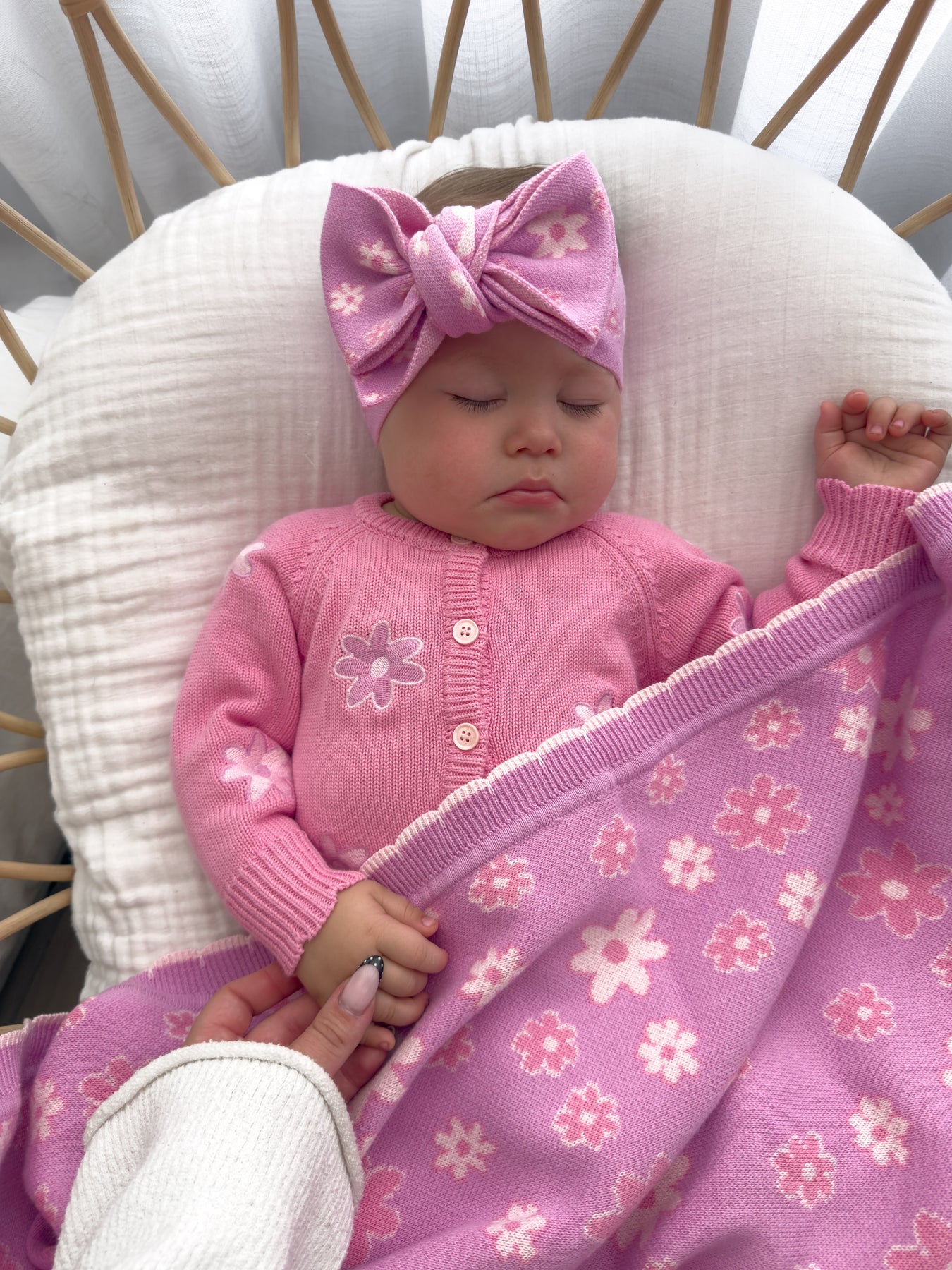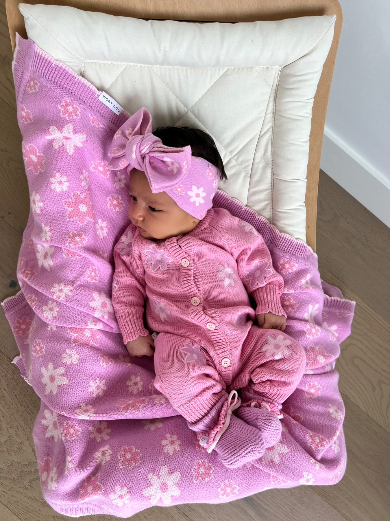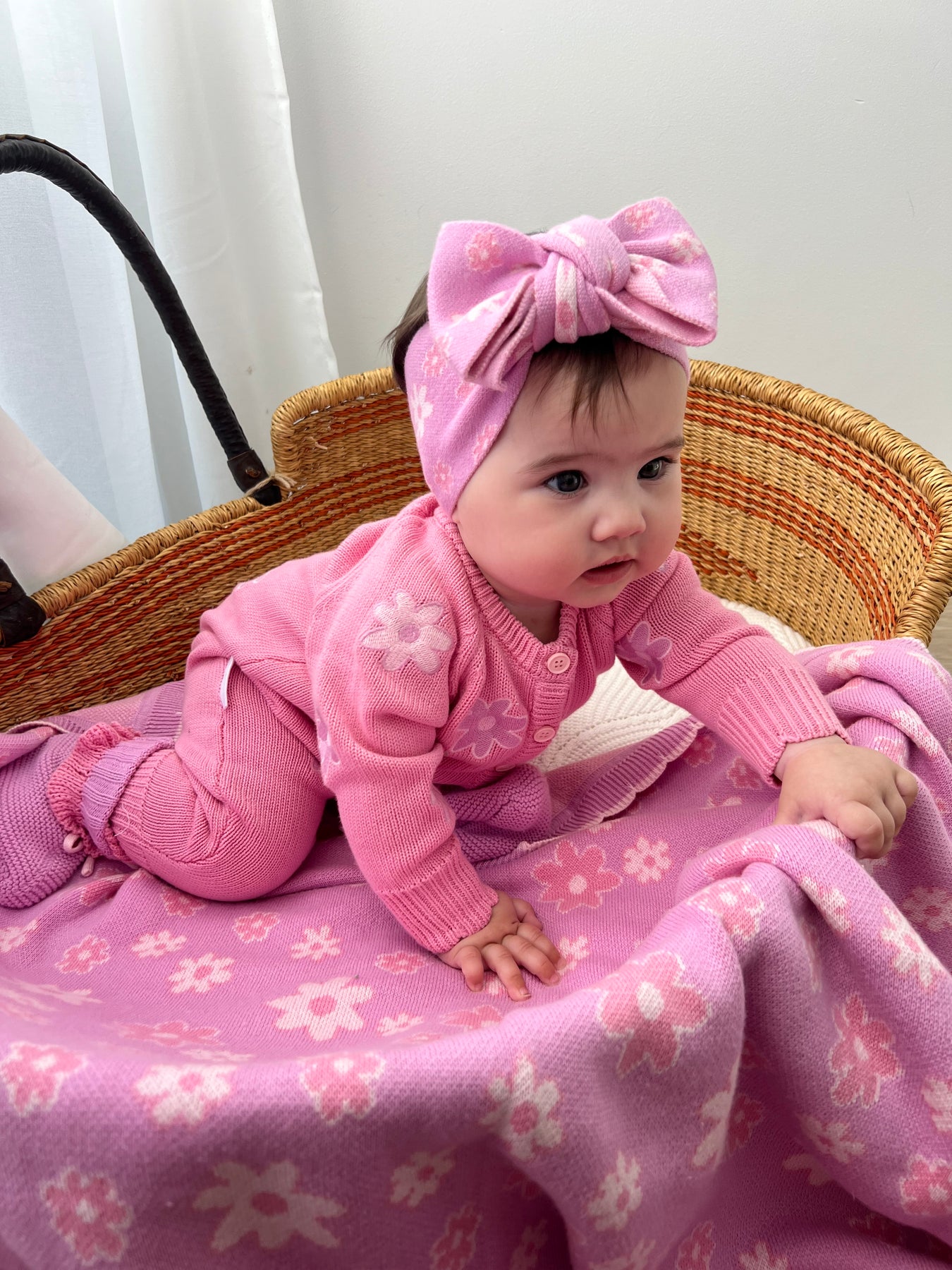 The matching jacquard knit blanket (100cm x 100cm) and booties with adjustable ties compliment for a perfect outfit.