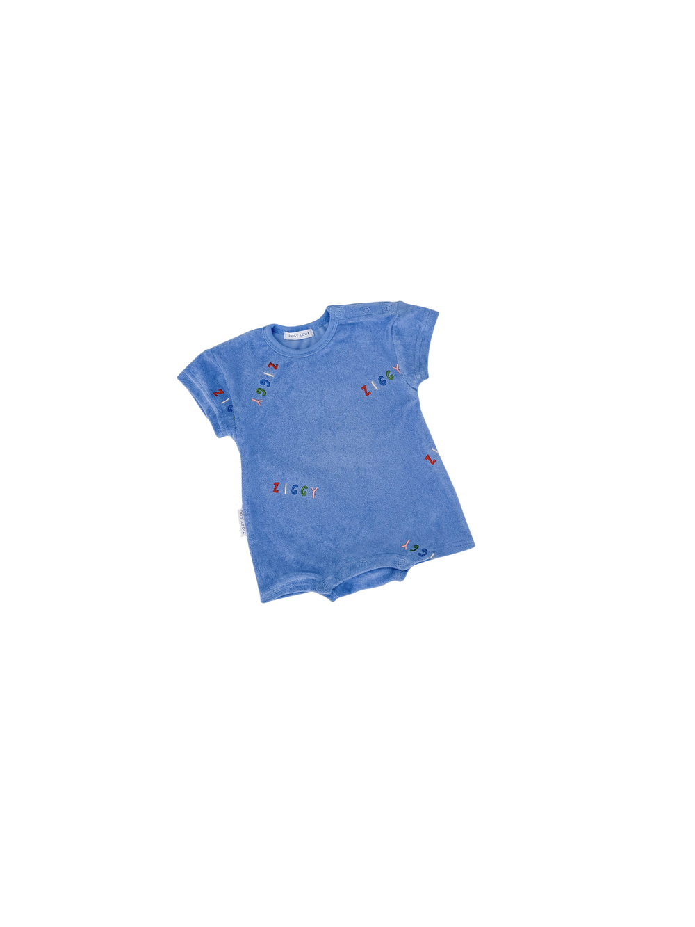 Terry towelling playsuit featuring our embroidered Ziggy Carnival design. Functional press snaps at crotch for easy nappy changes and press snaps at shoulders for easy on/off.
