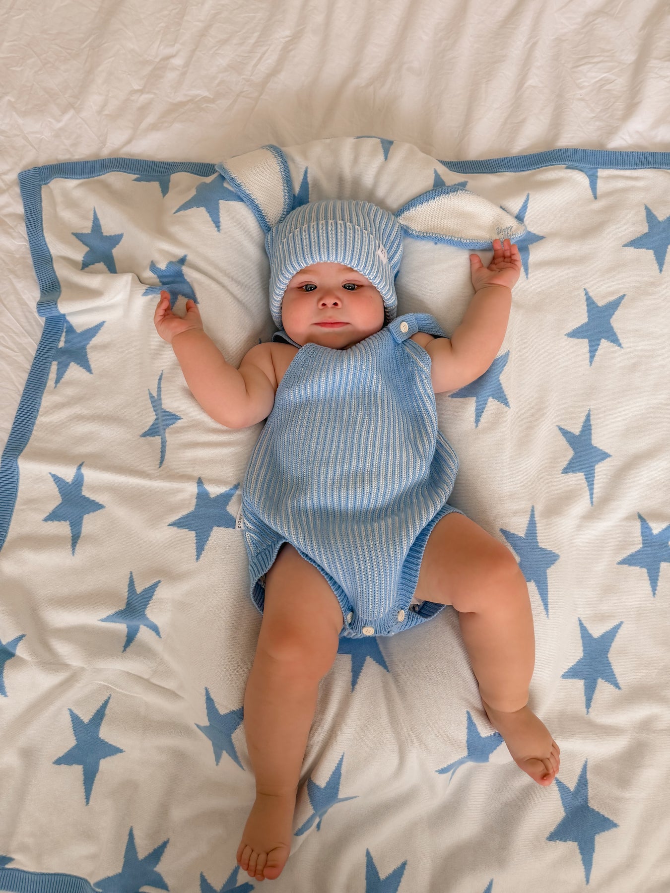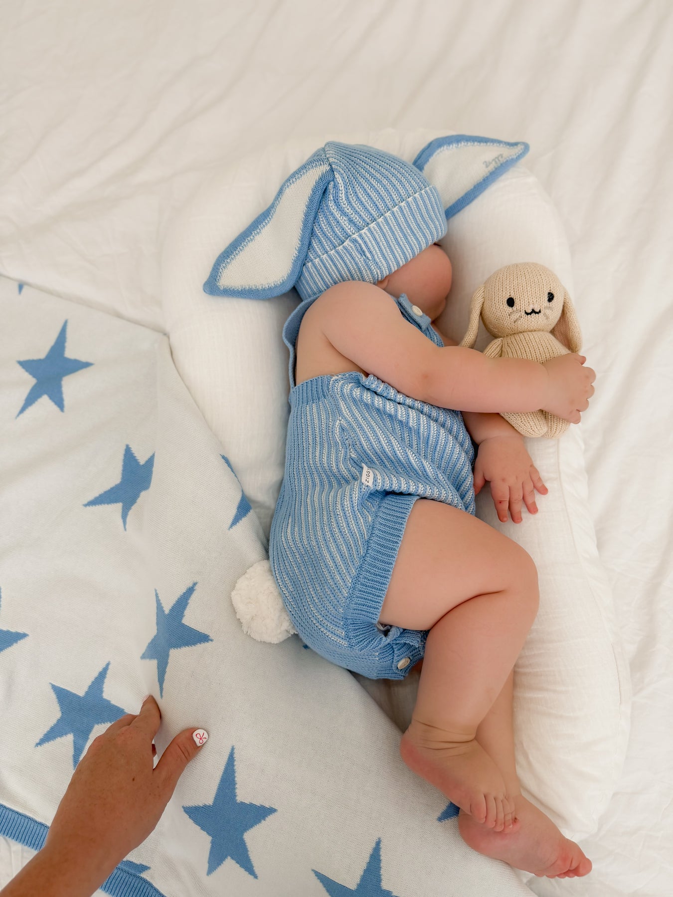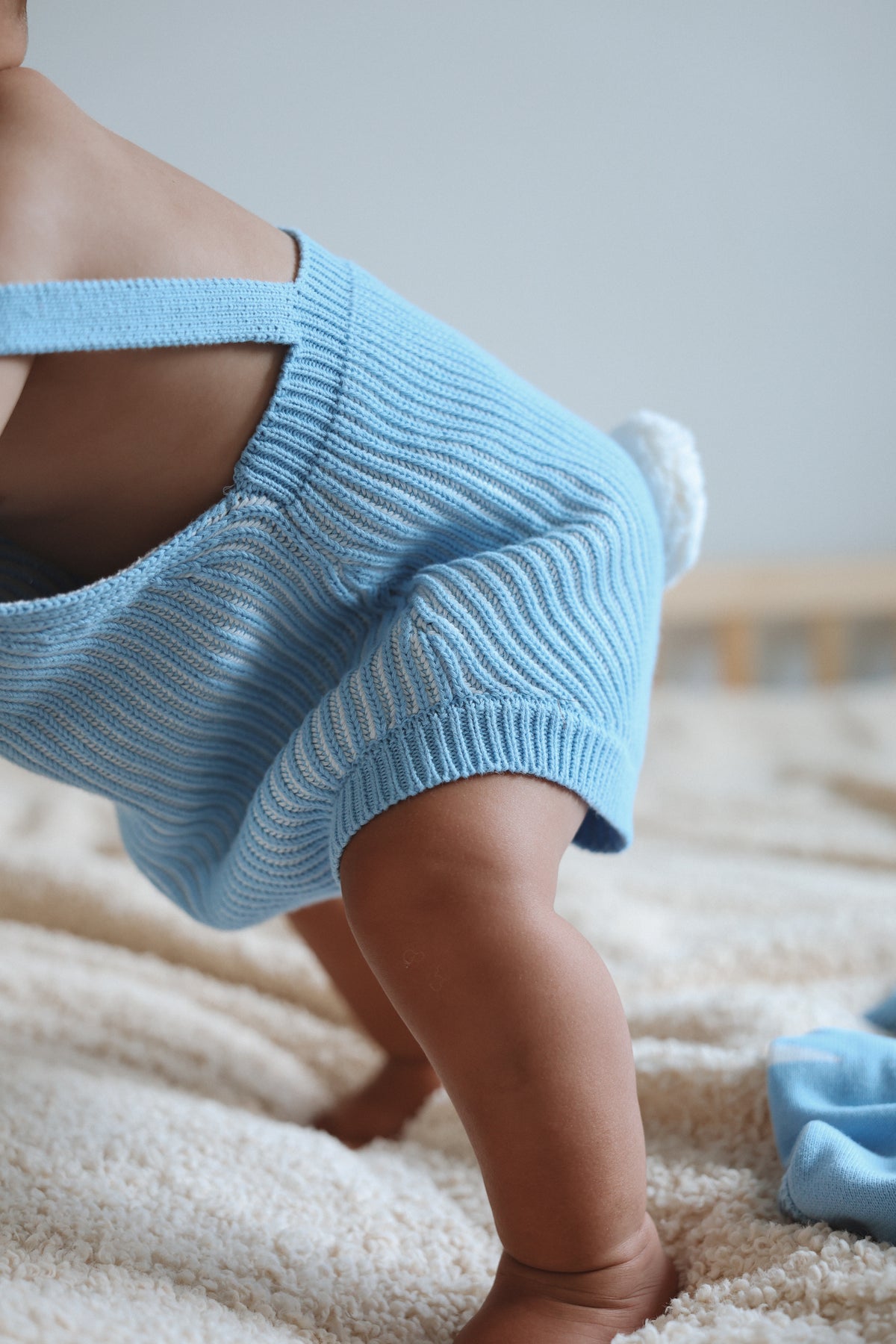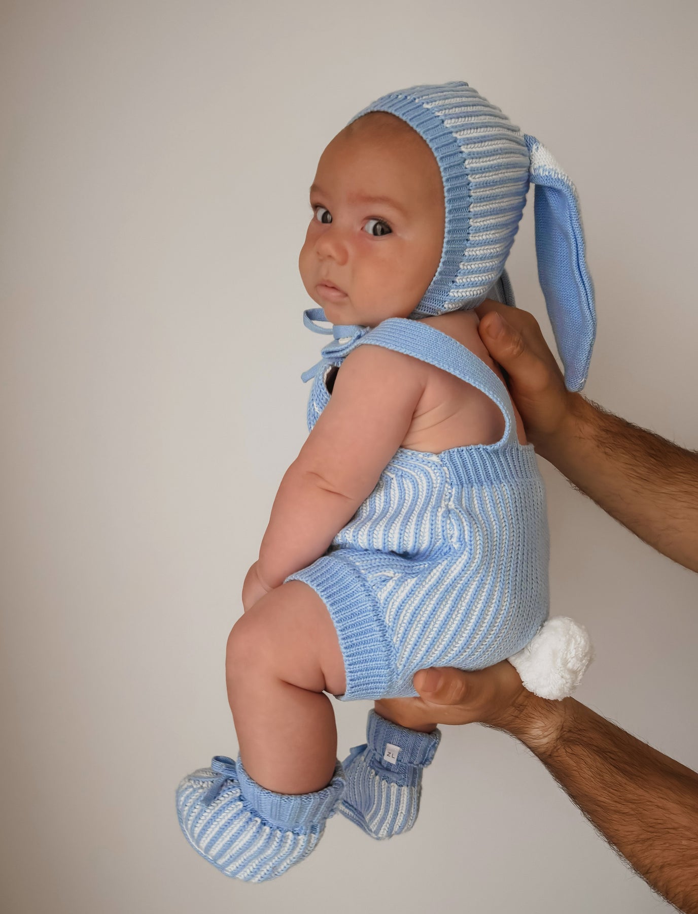 Braided knit romper in our River and Milk colours, featuring an adorable removable bunny tail (press snap). Functional buttons at crotch for easy nappy changes and buttons on at the shoulder to adjust straps and for easy on/off. Pair with items from our Beau Easter Collection for the perfect outfit.