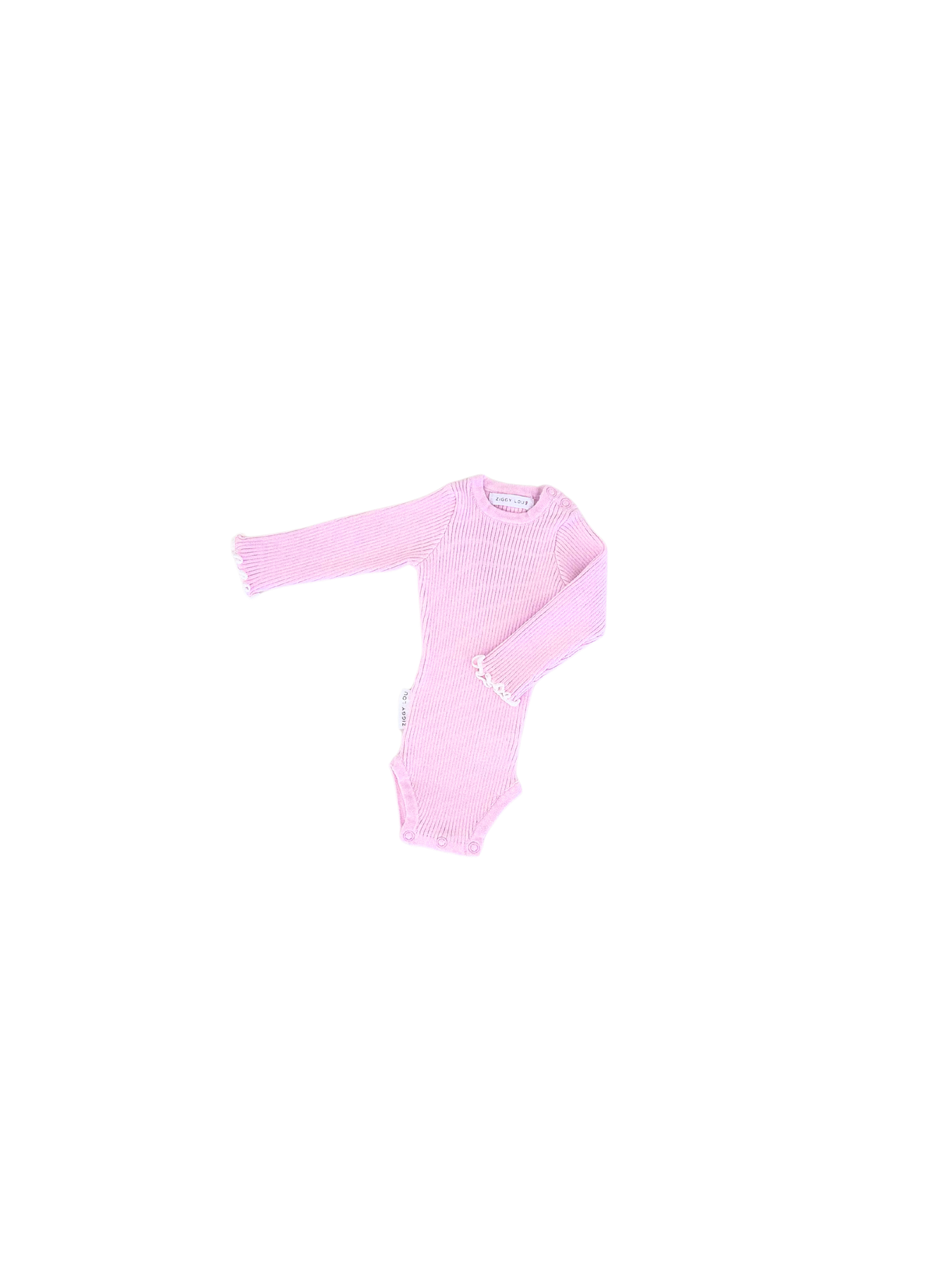 Ribbed, long sleeve bodysuit in our beautiful Lilac colour, featuring a ruffle cuff sleeve with milk stitch detail. Functional press snaps at crotch for easy nappy changes and press snaps on shoulder for easy on/off.