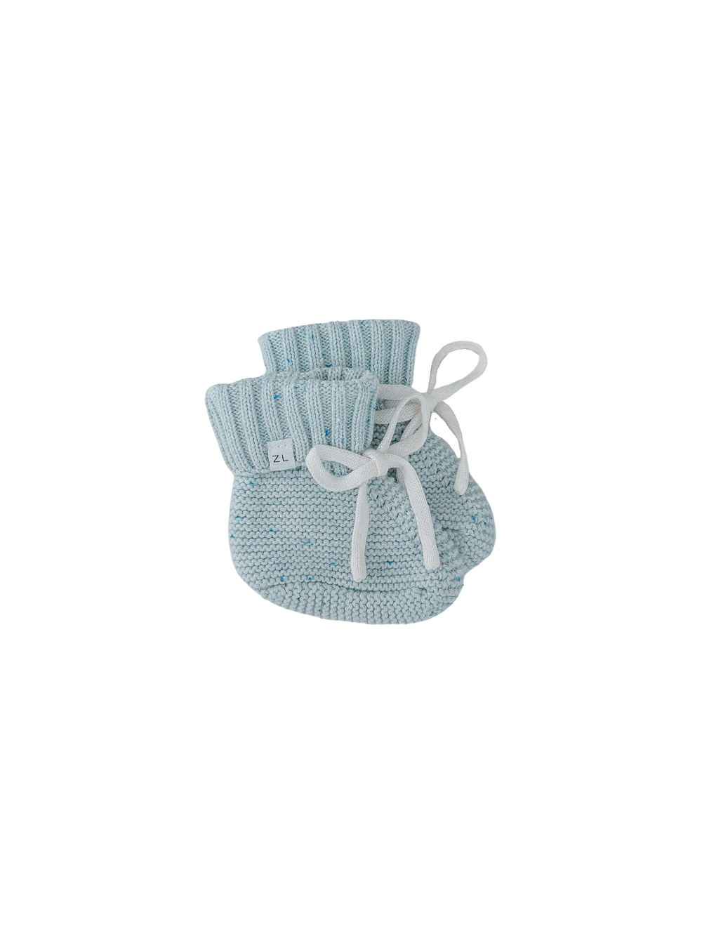 Knitted booties in our custom dyed Aero Fleck. Functional drawstring to ensure booties don't fall off when worn. Mix and match with items from our Aero Fleck Signatures Collection.