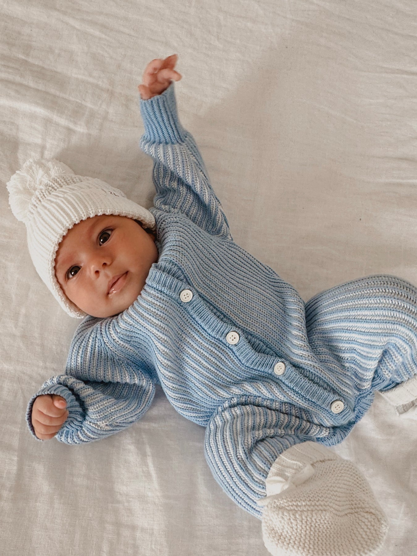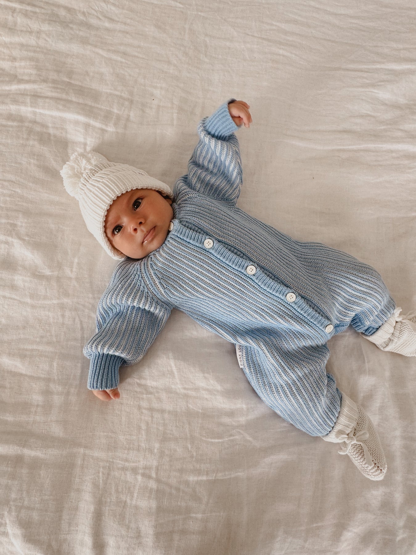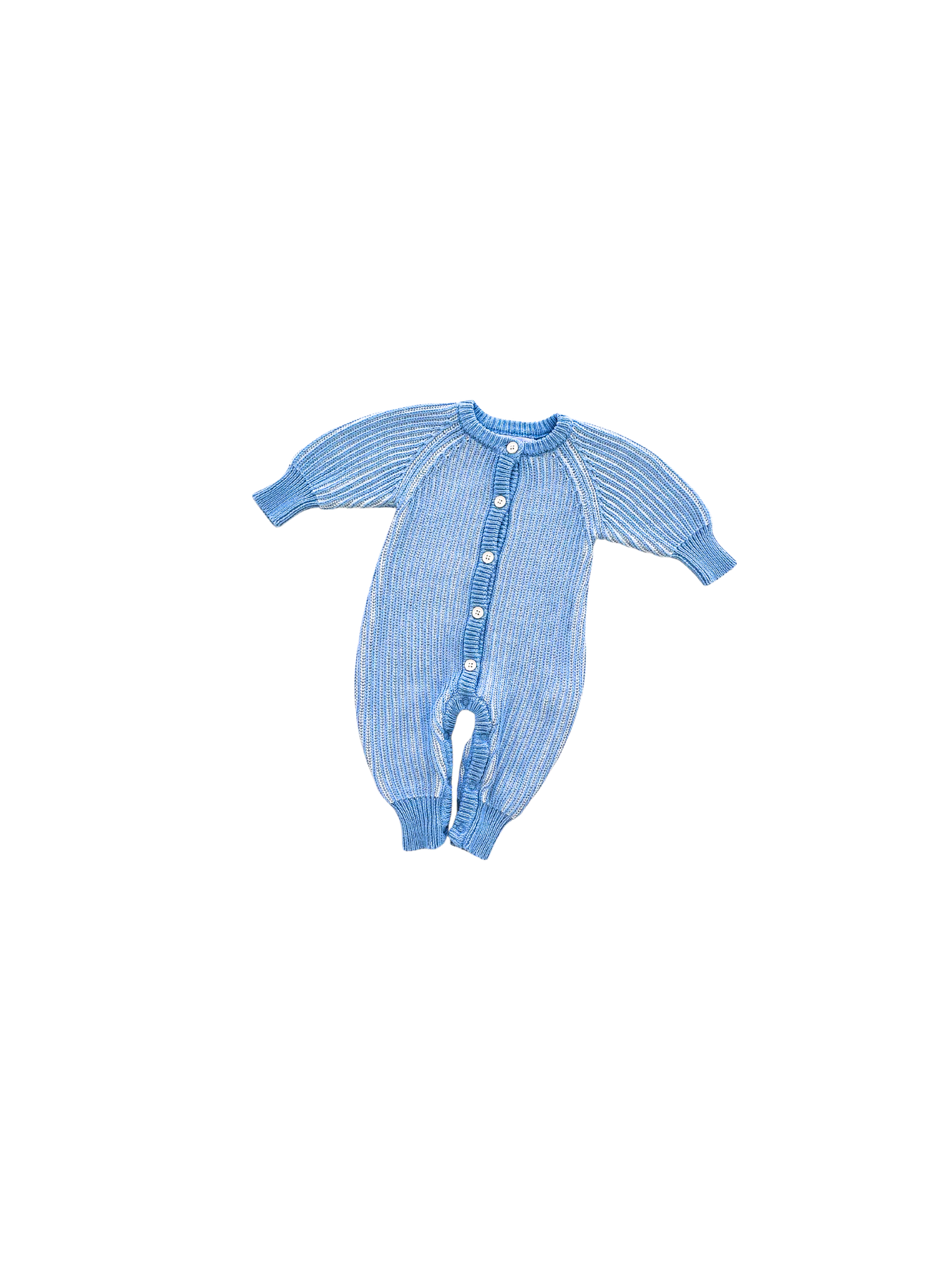 Braided classic knit romper in River + Milk colours featuring functional buttons down the front, snaps at crotch/leg for easy nappy changes and on/off.