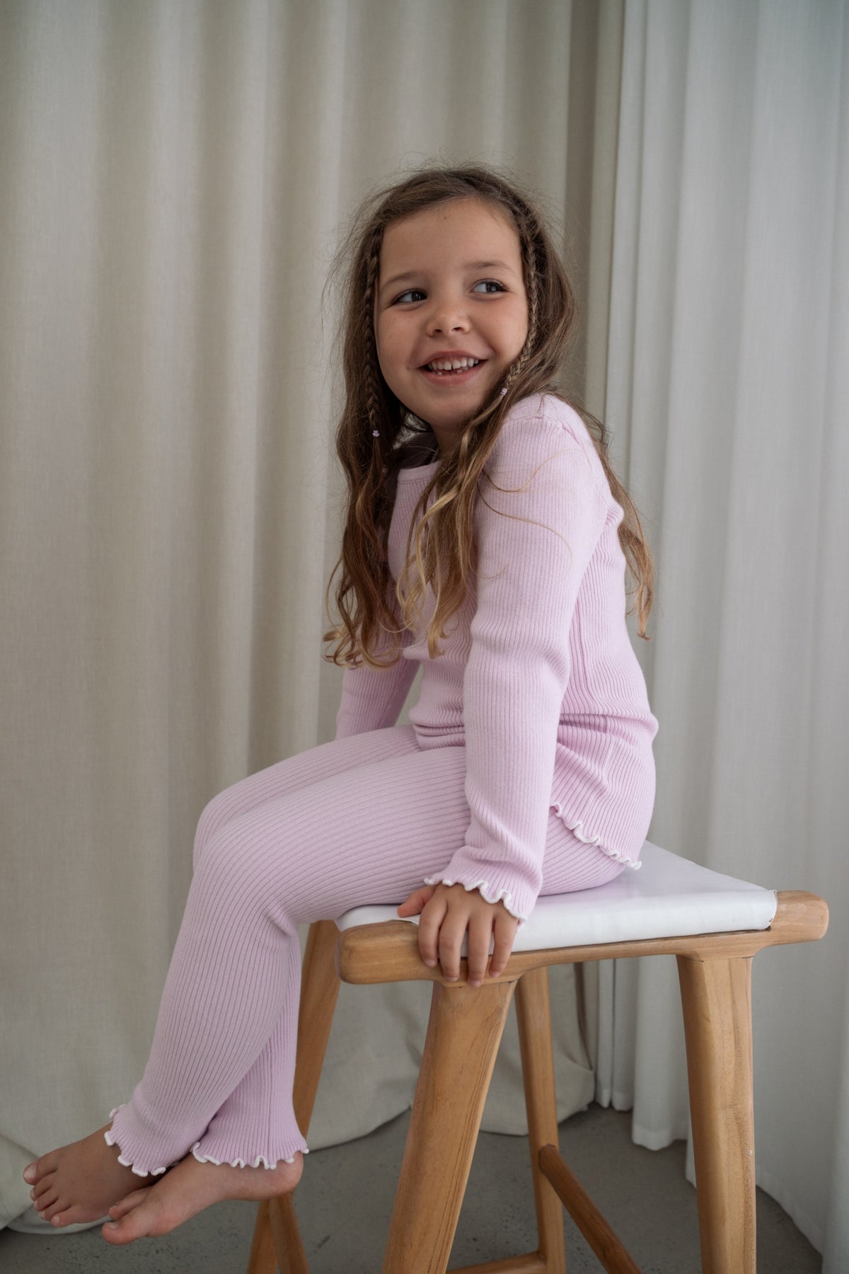 Our ribbed knit leggings in our Lilac colour feature a gorgeous frill ankle cuff detail with milk coloured stitching.